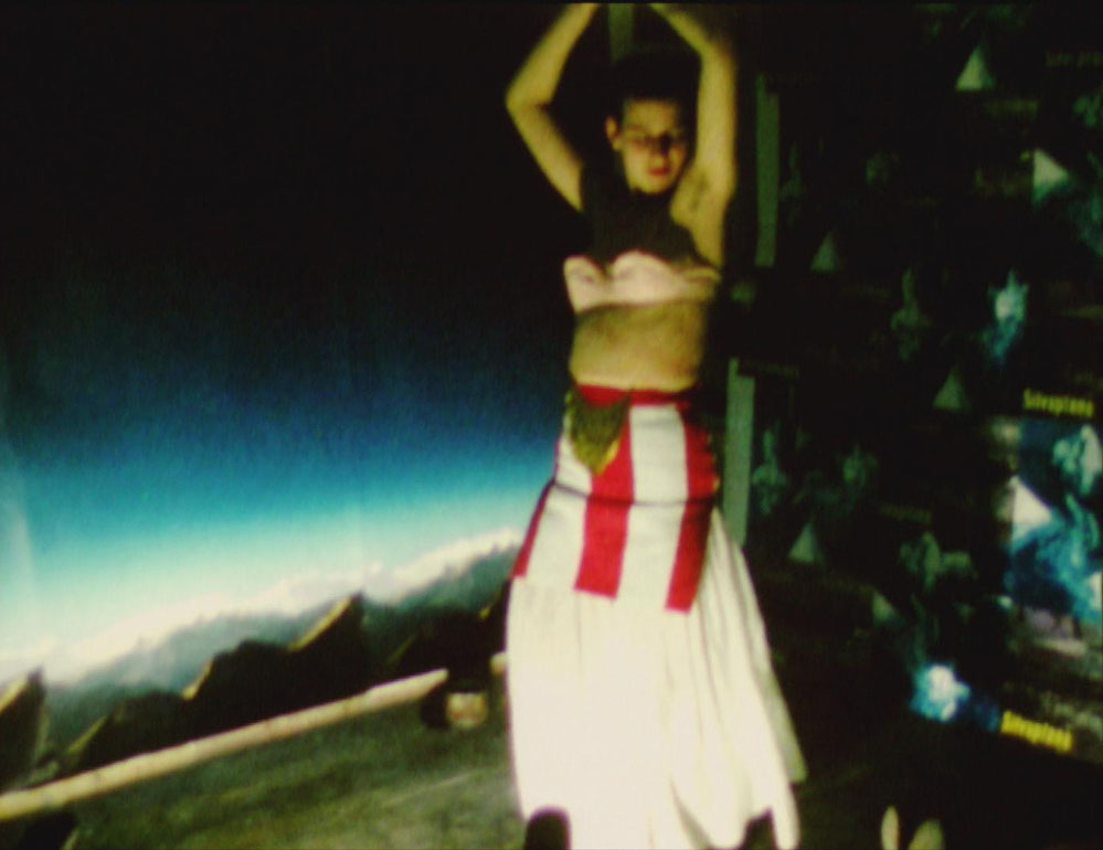 Ursula Pürrer moves her hips and practices belly dancing; Zora Marie Bauer watches. The two experiment with accessories, like the coin belt that is placed on Bauer’s head or made to ring and sparkle over Pürrer’s crotch. The dance is accompanied by Indian film music and switches from black and white to color. (Magdalena Steffan)