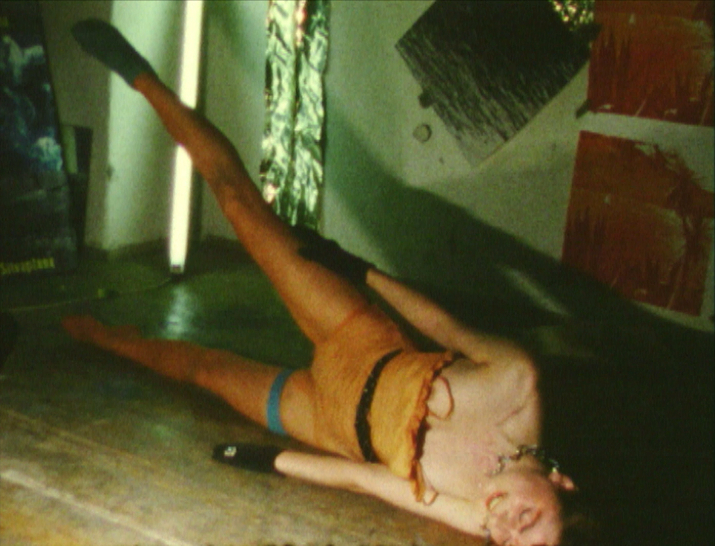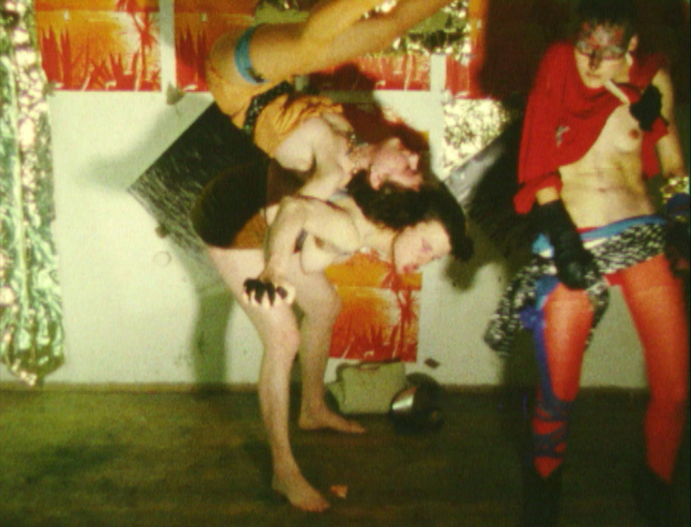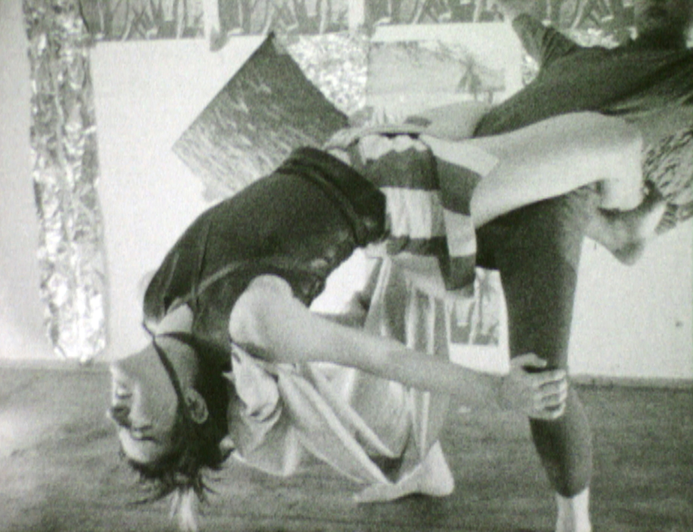 In costumes and partially masked, Scheirl, Pürrer, Bauer, and Jurtschitsch perform a number of gymnastics exercises. Balancing and floating on top of and over each other in various poses, they repeatedly fail to hold their positions for any length of time and happily start over again. Initially in black and white, the film suddenly changes to color. Against a gold-orange background, the gladiator holds herself majestically on the horse-drawn carriage – for a brief moment, at least. (Magdalena Steffan)