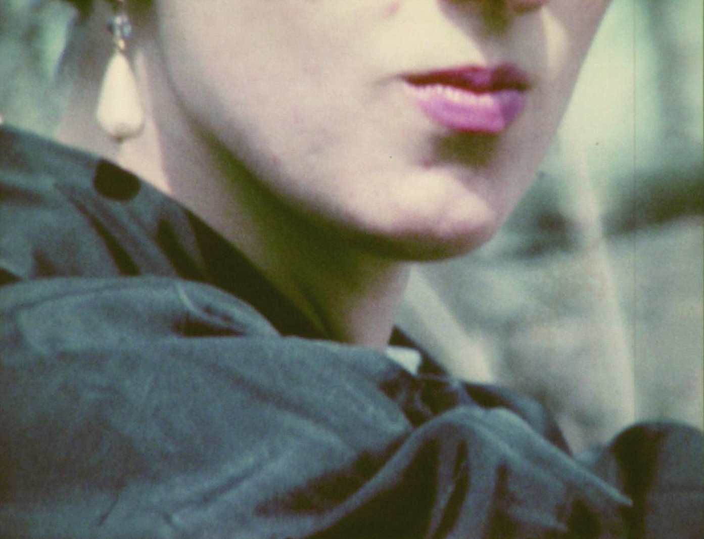 Ursula Pürrer plays Malena, the titular character of the track by KaS Product, which is playing in the background. She wears pink gloves with a gold ring over them, a black and white dress, and leather shoes and corset, with large pearl earrings in her ears, and expressive make-up on her face. She smokes a cigarette in a cemetery and then rests on a floor indoors. (Magdalena Steffan)