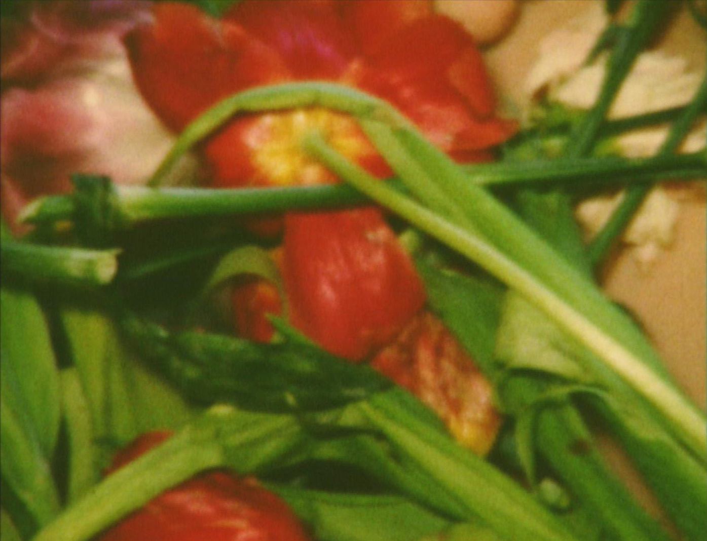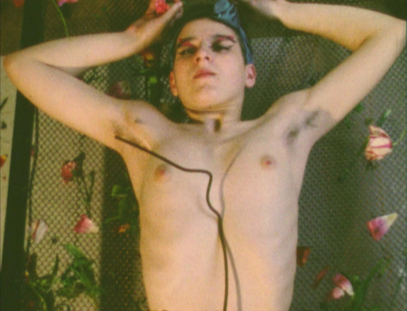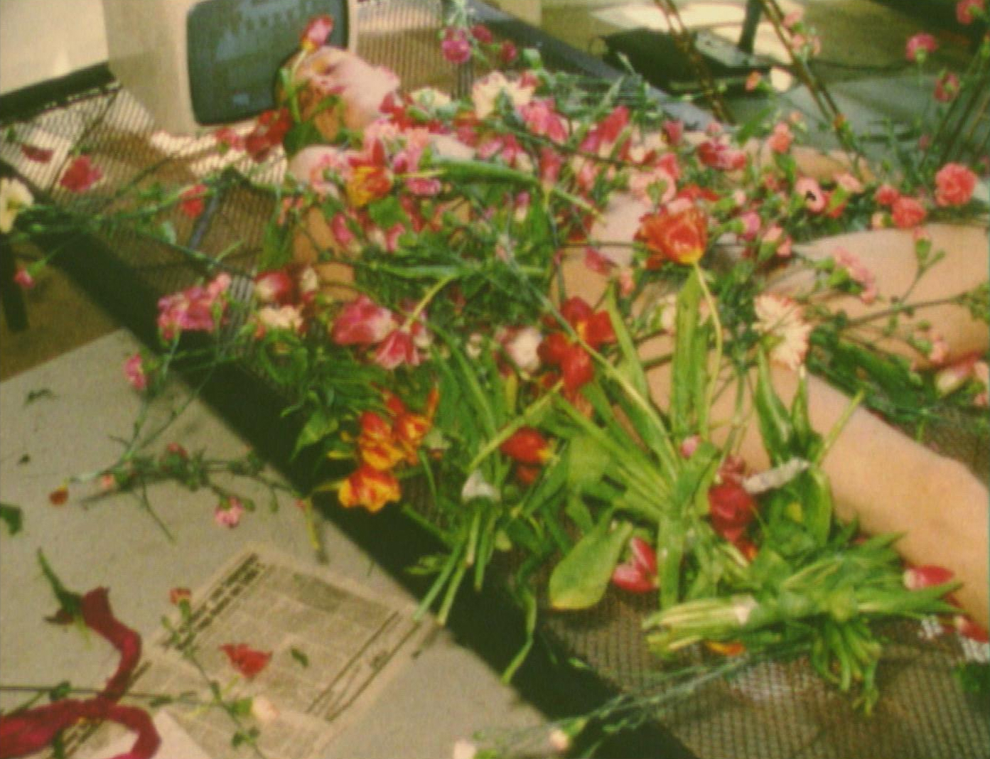 A naked body sprawls on a metal bed frame. They are touched, even pinched, by hard metal objects. In contrast, everything, the bed, even the television screen, is decorated with flowers that appear on the body and proliferate, finally covering it completely. (Magdalena Steffan)