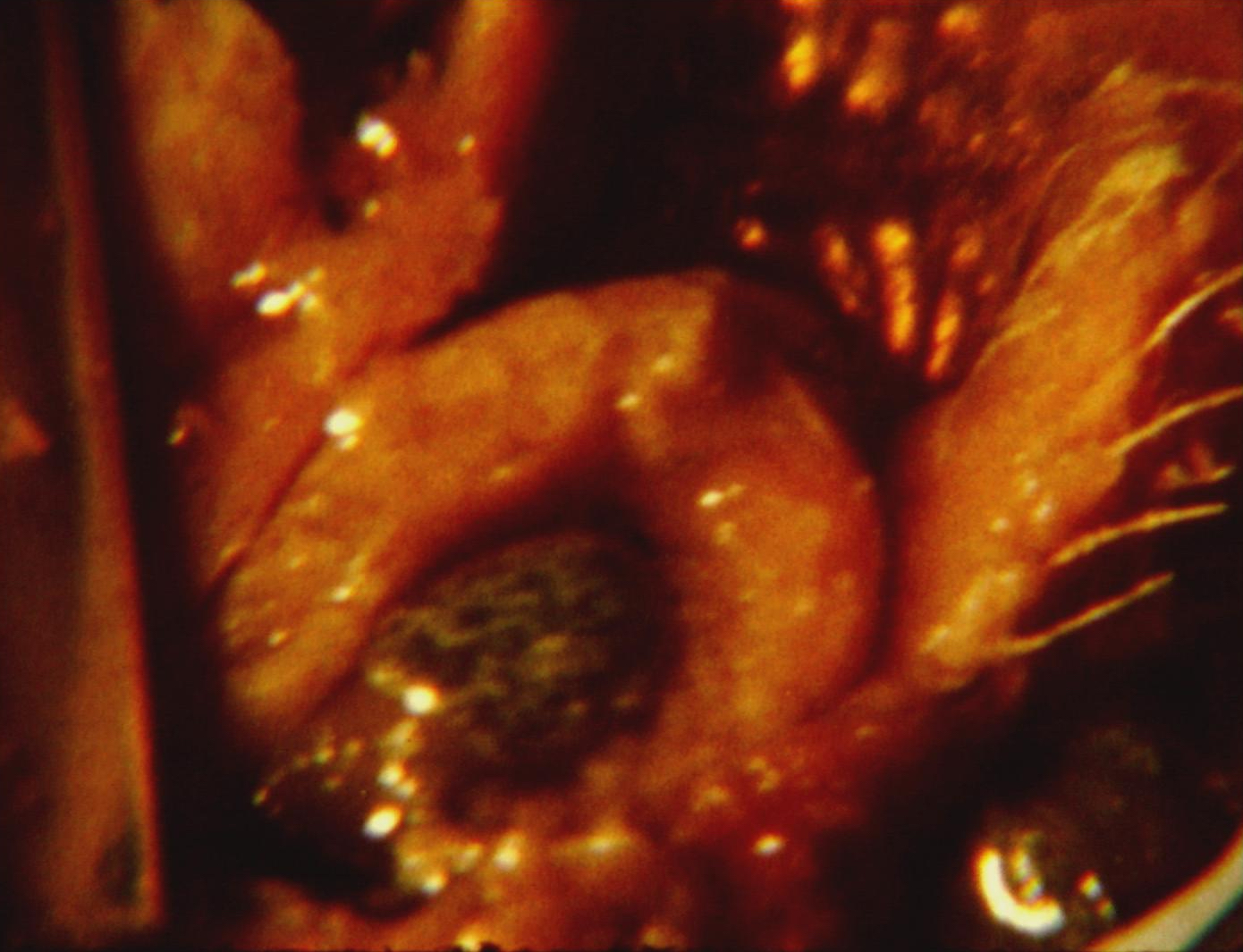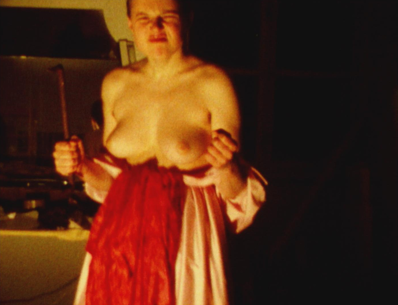 Television screens show ads, industrial landscapes, and an opulent chalice with a depiction of the Last Supper. A can of anchovies is examined closely by the camera. Pürrer in a tight shirt and Scheirl in a pink dress make their breasts jiggle. Short dynamic sequences are combined with music by Lydia Lunch. (Magdalena Steffan)
