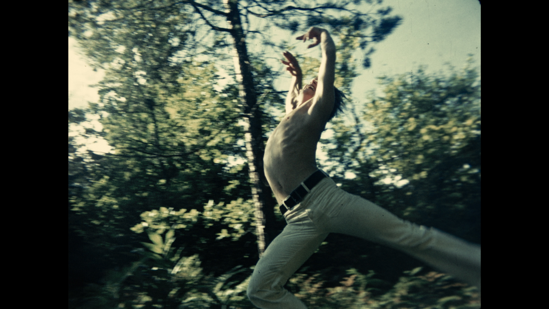 Structured like a duet, the film alternates between these piteous views of Lassnig and buoyant sequences featuring a sprightly, male dancer. He leaps and pirouettes with boundless, abundant energy through alpine fields and sun-dappled forest clearings, the picture of youth. First fully dressed, in the midst of his rapturous cavorting, an abrupt cut renders him shirtless, as if puffing up his bare chest with cartoonish male confidence. The camera’s gaze lingers on his beauty, an evocative and desiring female gaze objectifying a male specimen. The more Lassnig struggles, the more the dancer excels, soaring and spinning through the foliage. Lassnig emphasizes his centripetal, magnetic force by speeding the film’s tempo and blurring some of the frames, telegraphing a frenzied, brainless optimism through lofted movements and wide grins.