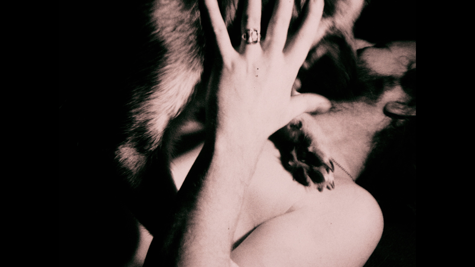 Dogs appear throughout Lassnig’s work, at times as domestic companions, and other times as philosophical portals. In a series of aquarelles and drawings about the “inner eye” (1978–80) — one titled “Dog” as Mental Image — Lassnig used the figure of the dog to investigate the connection between what we see with the naked eye and how this intermingles with images we hold in our mind. Lassnig writes “The truth is that I don’t see anything with closed eye[s] … Instead of a dog, layers and lines appear,”(1) “stains with feet, undergrowth with ears and tails,”(2) a description that comes to life in Dog Film. Using multiple exposures, Lassnig creates a filmic collage of wagging tails, toothy snouts, groping paws, and panting tongues tangled together to form ghostly chimeras that are part-dog, part-human. (Jocelyn Miller, Maria Lassnig. Film Works/ Filmography [excerpt])
