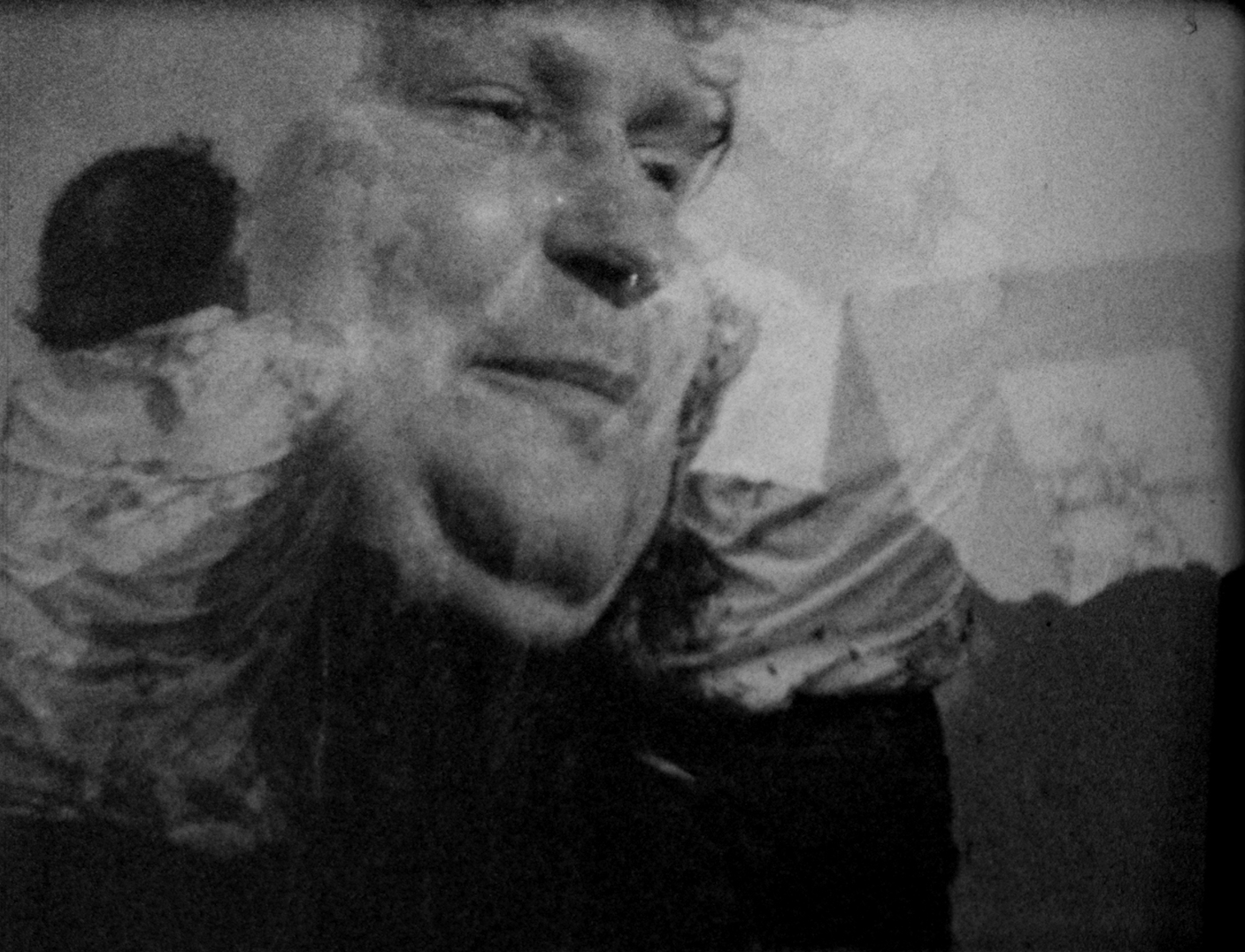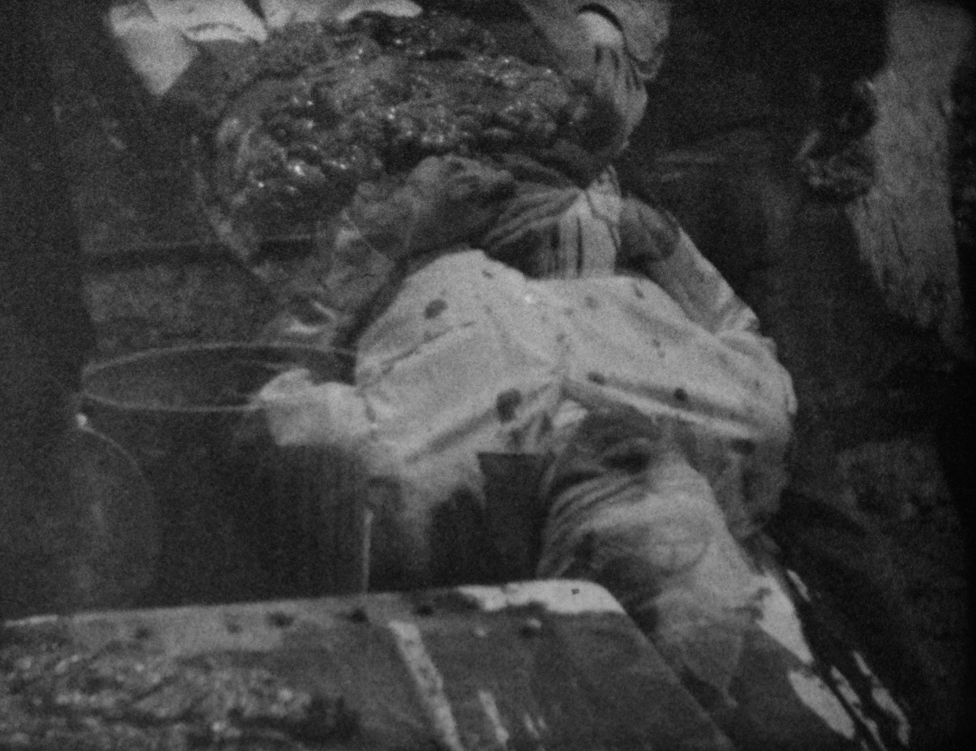 With her own footage of Nitsch’s performance as a point of reference, Lassnig contrived her own staged actions: a man (Roger, her neighbor) is filmed in stiff repose, echoing iconic images of martyrdom like Hans Holbein’s The Body of The Dead Christ in the Tomb (1522); elsewhere, he wears a gas mask that alludes to the Vietnam War, which was being waged at the time of filming. Lassnig overlays scenes of Nitsch’s performative rituals with images of him visiting her studio, sitting around the table socializing. Lassnig inserts herself further into the intensity of the action through additional exposures of the film stock; her crouched, naked body appears in brief sequences, offering her own kind of ritual action. (Jocelyn Miller)