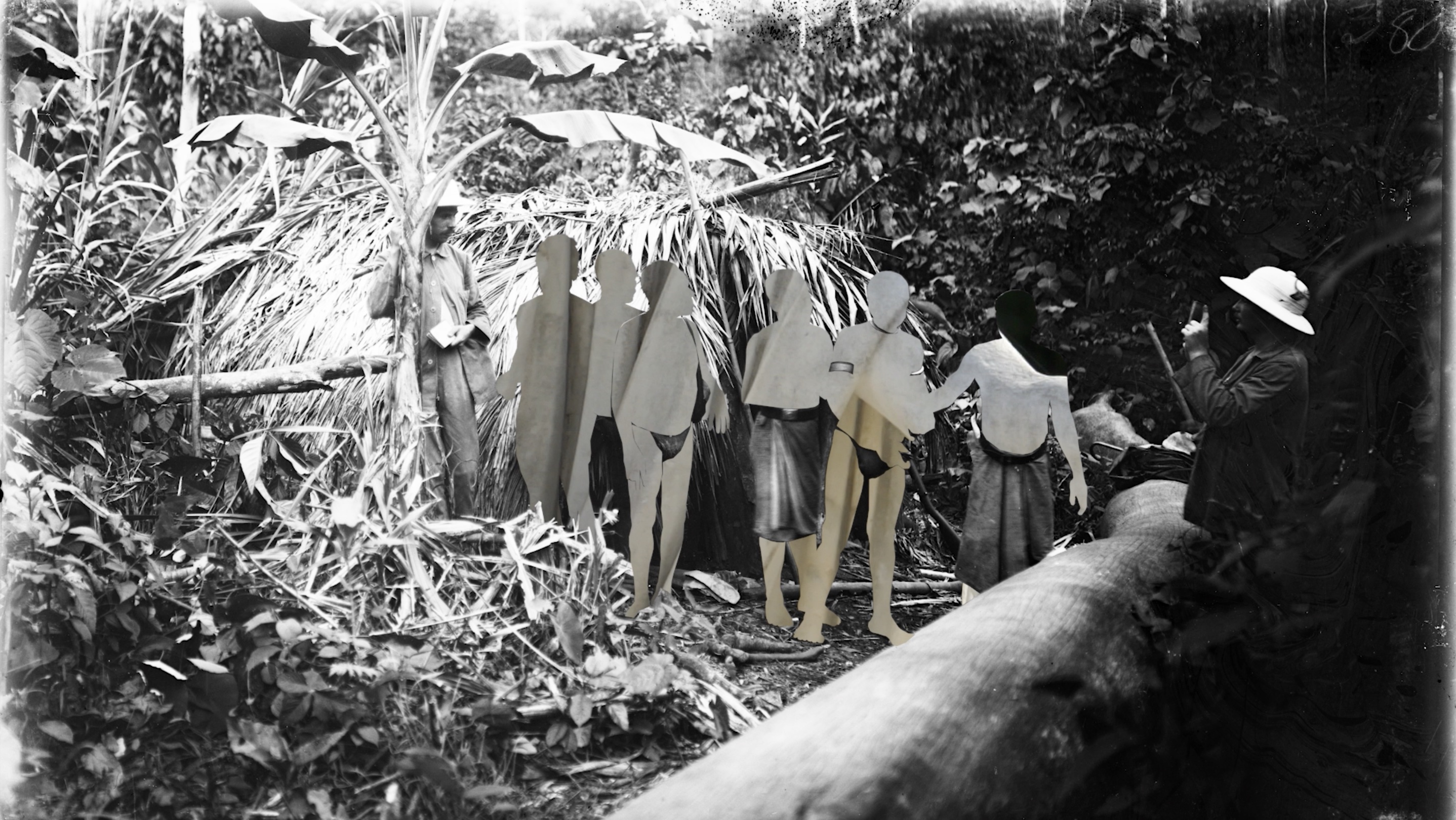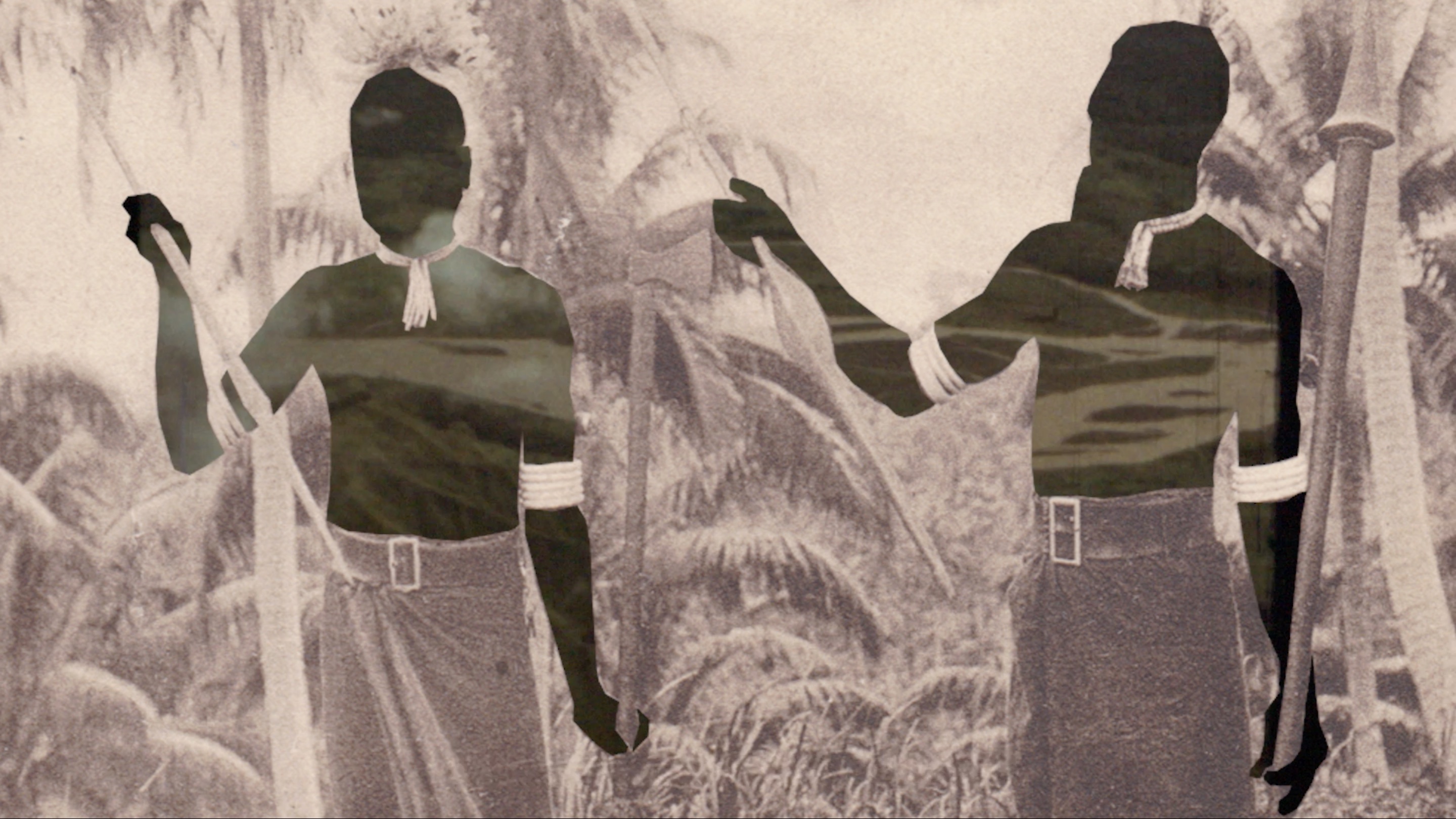 It is exactly these objectified people who are cut out of historical post-cards and photos that appear in the film, leaving haunted silhouette windows through which archival material of European expeditions are glimpsed. The use of these mattes concentrates and magnifies the filmic gaze, effectively serving as a second camera eye focused on our own colonial gaze. The observers of the film no longer see the people who have been reduced to "Scenes of Violence", but instead those who participate in these forms of categorization and pejorative judgement, namely, the Europeans. Saint Pere achieves a reversal through this formal accentuation: Europeans who assume seemingly heroic poses as observers instead are transformed into objects of critical investigation. The voice-over repeats the phrase, "...as in the thought patterns of the European colonies", to precisely clarify how contemporary meanings of the concept "Kanake" – as guest-worker, refugee and so-called unassimilated individual – continues to be associated with colonial and racist imagery. In the past as in the present, the word serves as a form of categorization that legitimizes violence and guarantees an unjust system while it perpetuates unfair power structures and further forms of discrimination. (Cana Bilir-Meier)