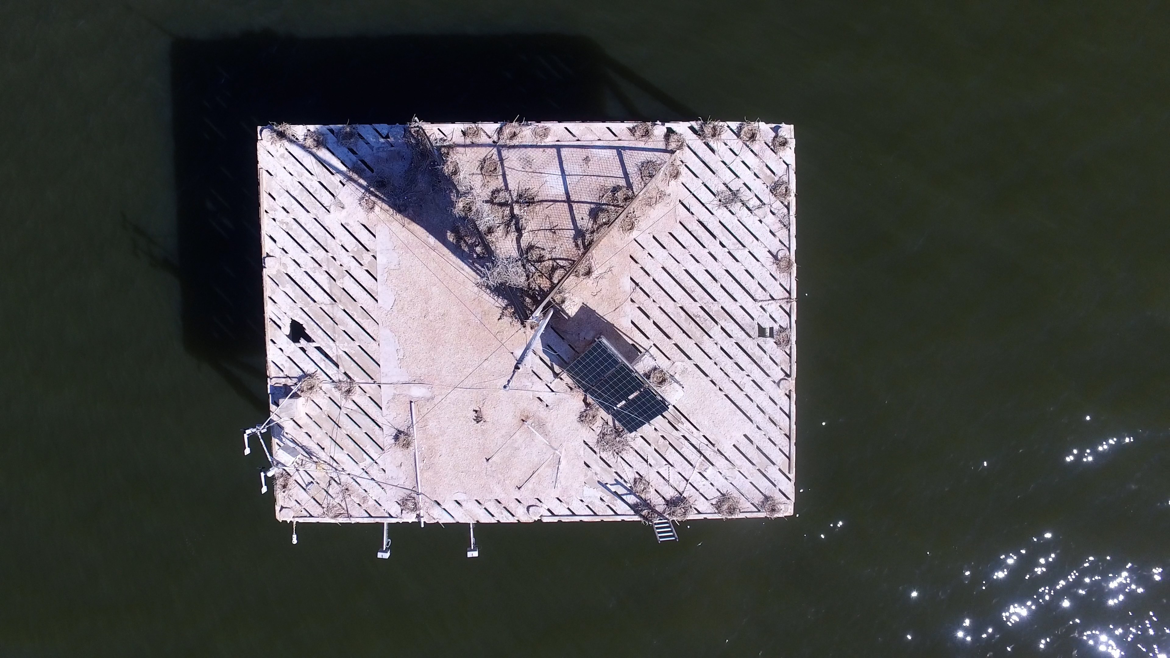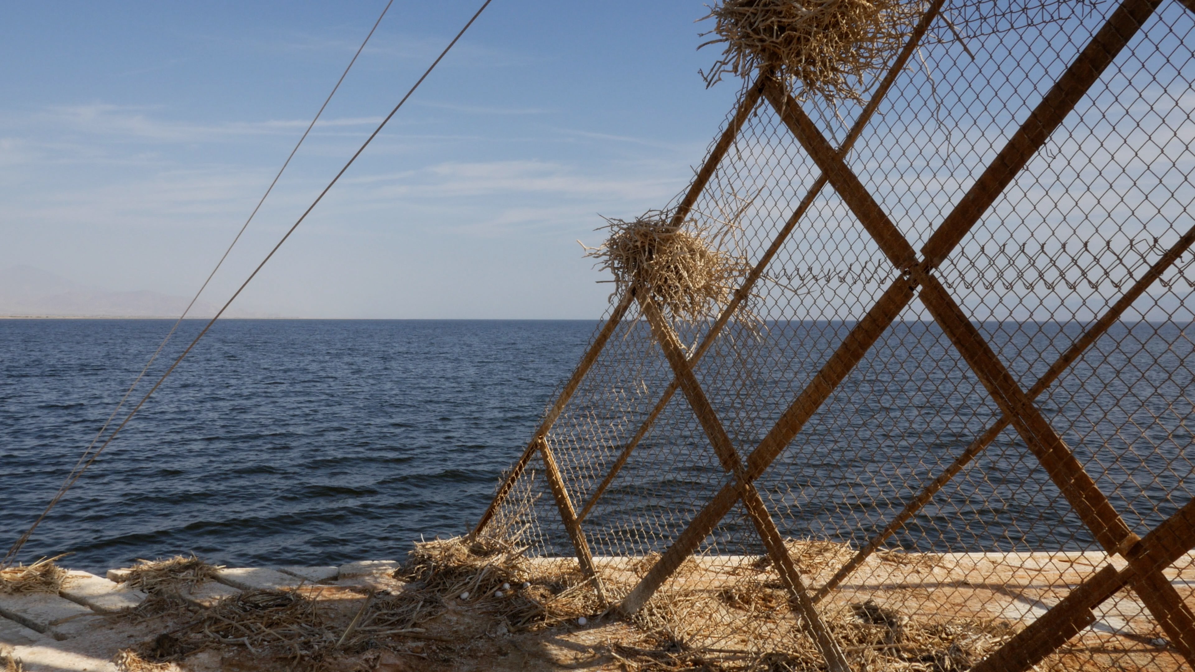 The surface of the Salton Sea reflects the glistening sunlight. Sediment colors the water green at times, at the edge of the image, almost bluish. The camera that captures this gentle flickering and flowing, floats far above a white rectangle. It moves slowly toward this structure, in the midst of the body of water bordered only by the frame, before looking around at the small, weathered platform in gradually arranged shots.