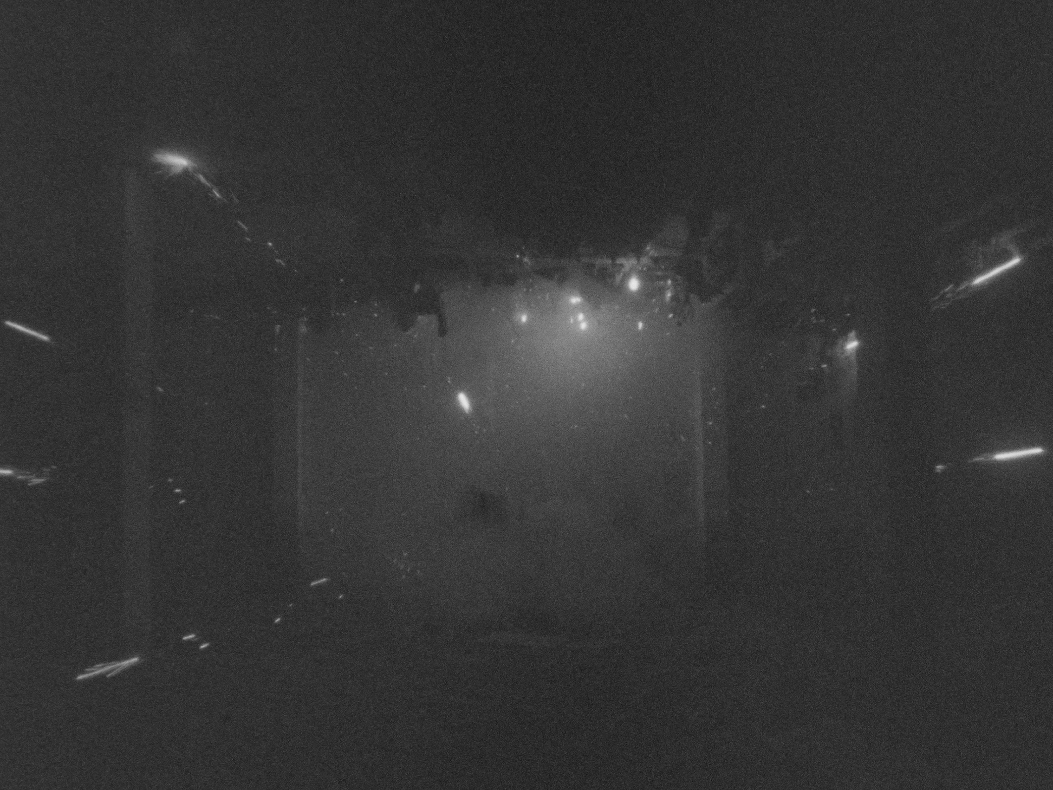These images turn out to be different interior spaces, flashed in phases by the ignition, sites that have long since given up their original functionality. In the explosion they are combined into a dwelling of spectacle. Boxes lie on top of each other like overturned tombstones and the walls are peeling – a legacy that invites a ceremonial continuation of the erosion and at the same time reverses this process. The prelude here is what is usually presented as the final climax of a pompous ceremonial act: pyropomp! We are led to the reversal, which includes the black and white sixty-year-old 16mm footage of where this invigoraing bang takes place. Director Eginhartz Kanter layers the destruction: damage to the building, damage to the film material, bombastic damage audio of a fictionalized past, the preservation of the moment in decay.