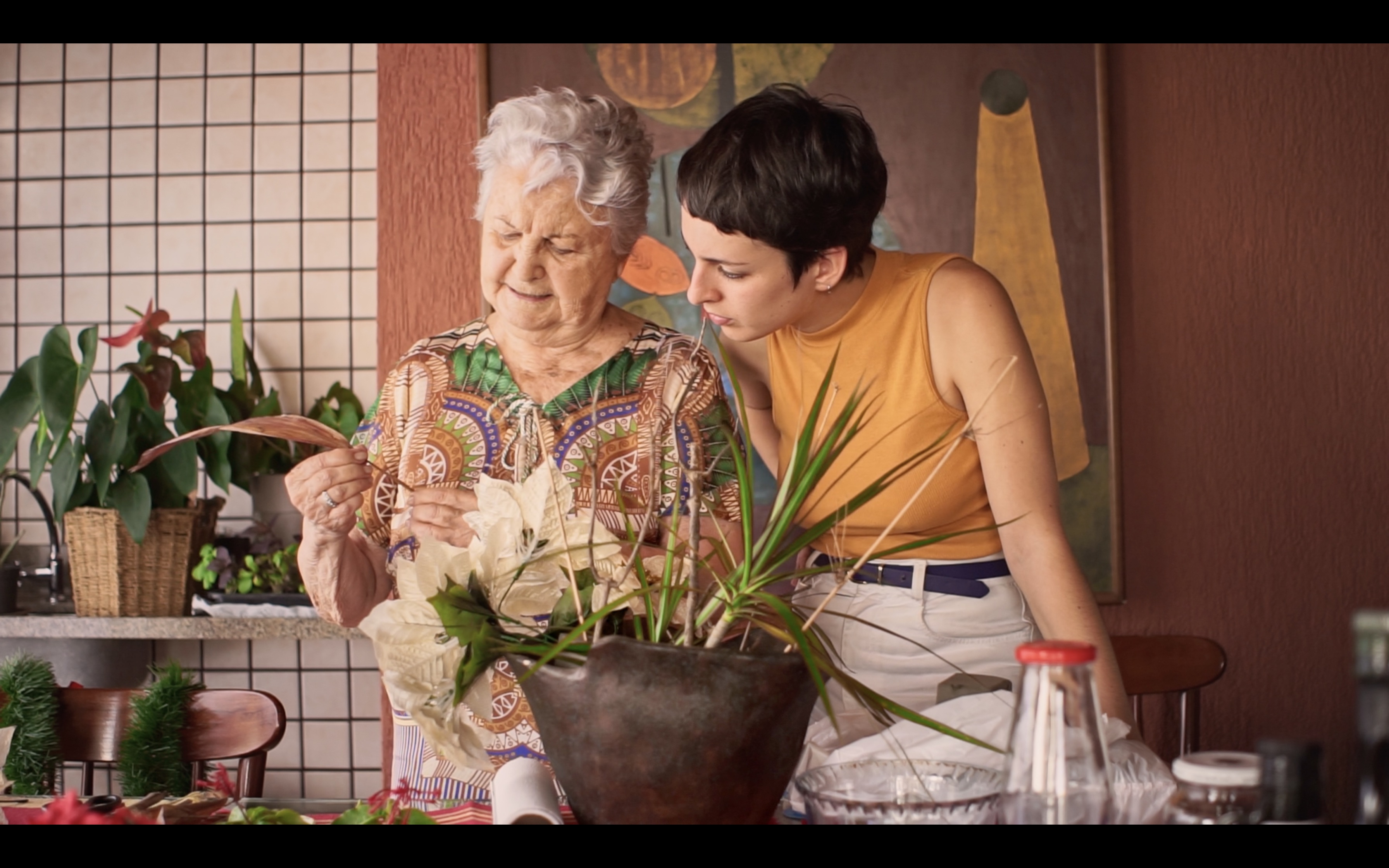 The importance of finding community – even in unexpected places – is a common thread running through Vitória Monteiro's film. In the dialogue between grandmother and granddaughter – the filmmaker herself – a thoughtfully arranged network of references emerges, similar to a flower arrangement. Feminized labor, technology, ideas of nature and femininity, the transmission of knowledge across generations, neocolonialism, and flowers (the main theme of the film) – all of these are conceptualized together. Over the course of several meetings, the grandmother opens up to her granddaughter in front of the camera. She tells of her loneliness and of having found her autonomy by working with flowers and making friends with the birds and butterflies. Hence the title of the film, Mis amigos son los pájaros.... The granddaughter, of generation online feminism, reports in a voiceover about her own experience of having access to a community through the internet, and along with it, feminist perspectives, exchange, and encouragement. The film images reflect this encounter and can partly be seen as a double projection. Demo footage of the Ni una menos protests from 2015 becomes visible, while in-between, animated flowers begin to sprout into the picture and take their place – insistently, as a disturbance, as a glitch. The glitch could signify the courage to create new worlds and expand the existing one.