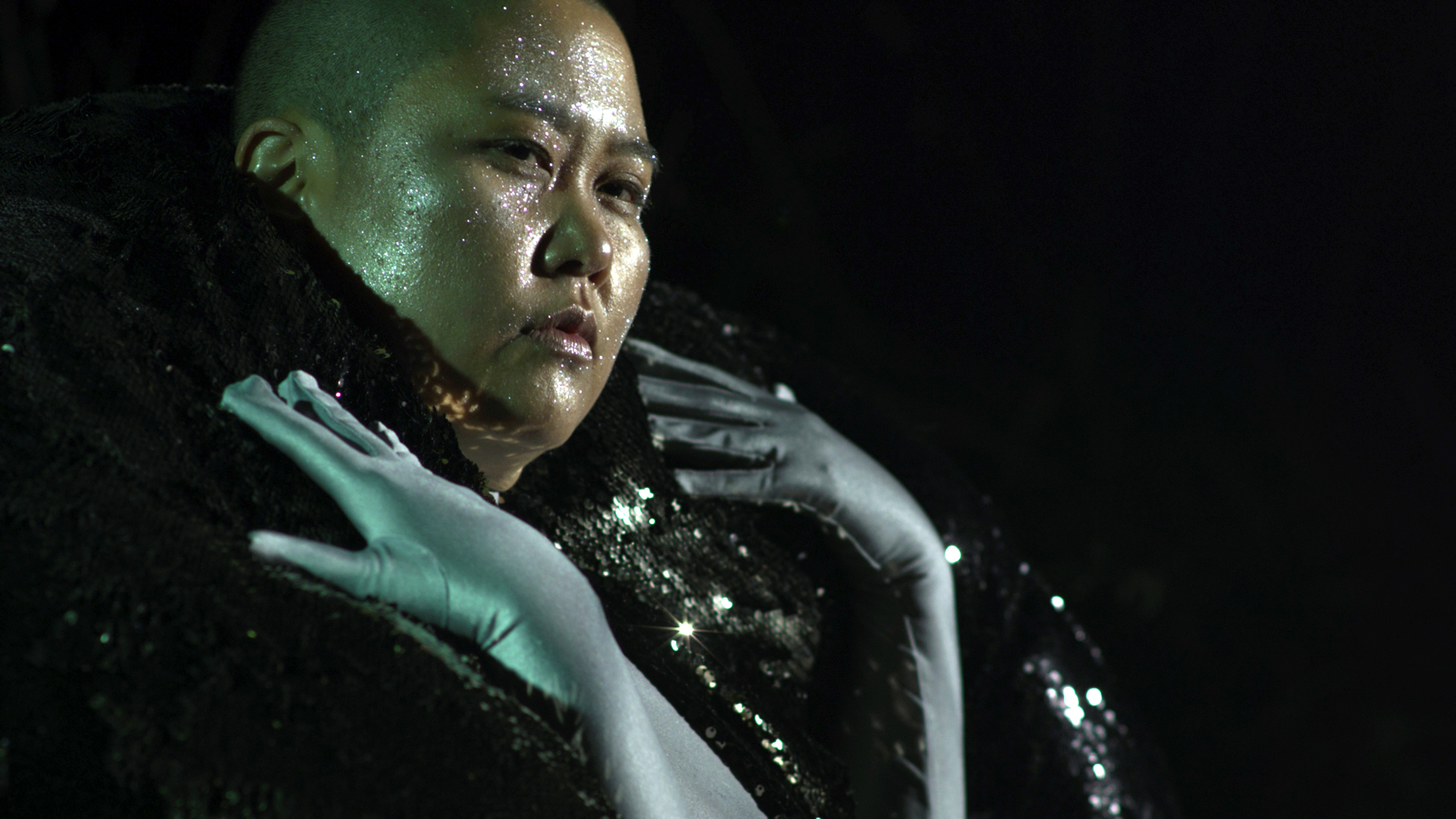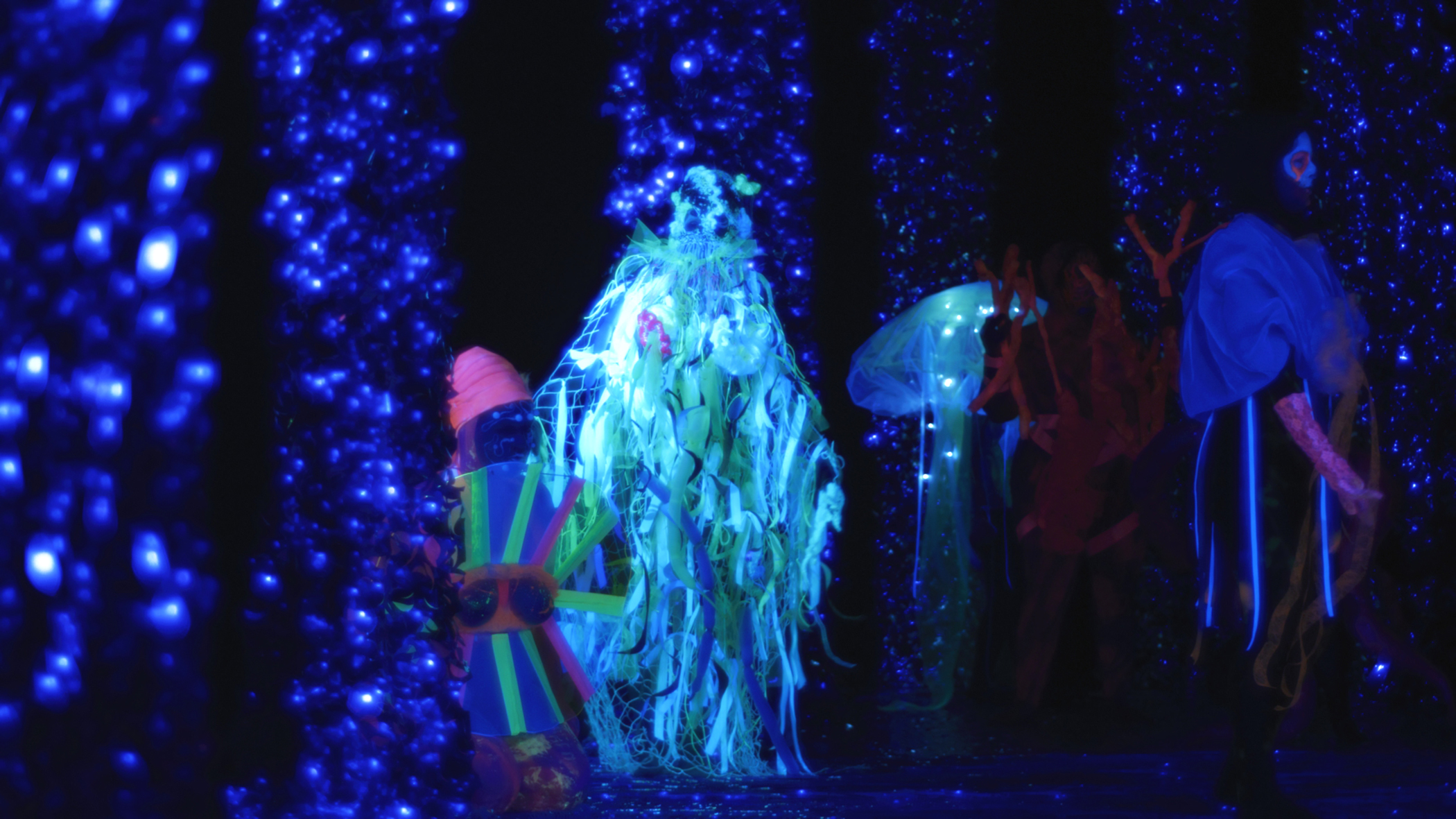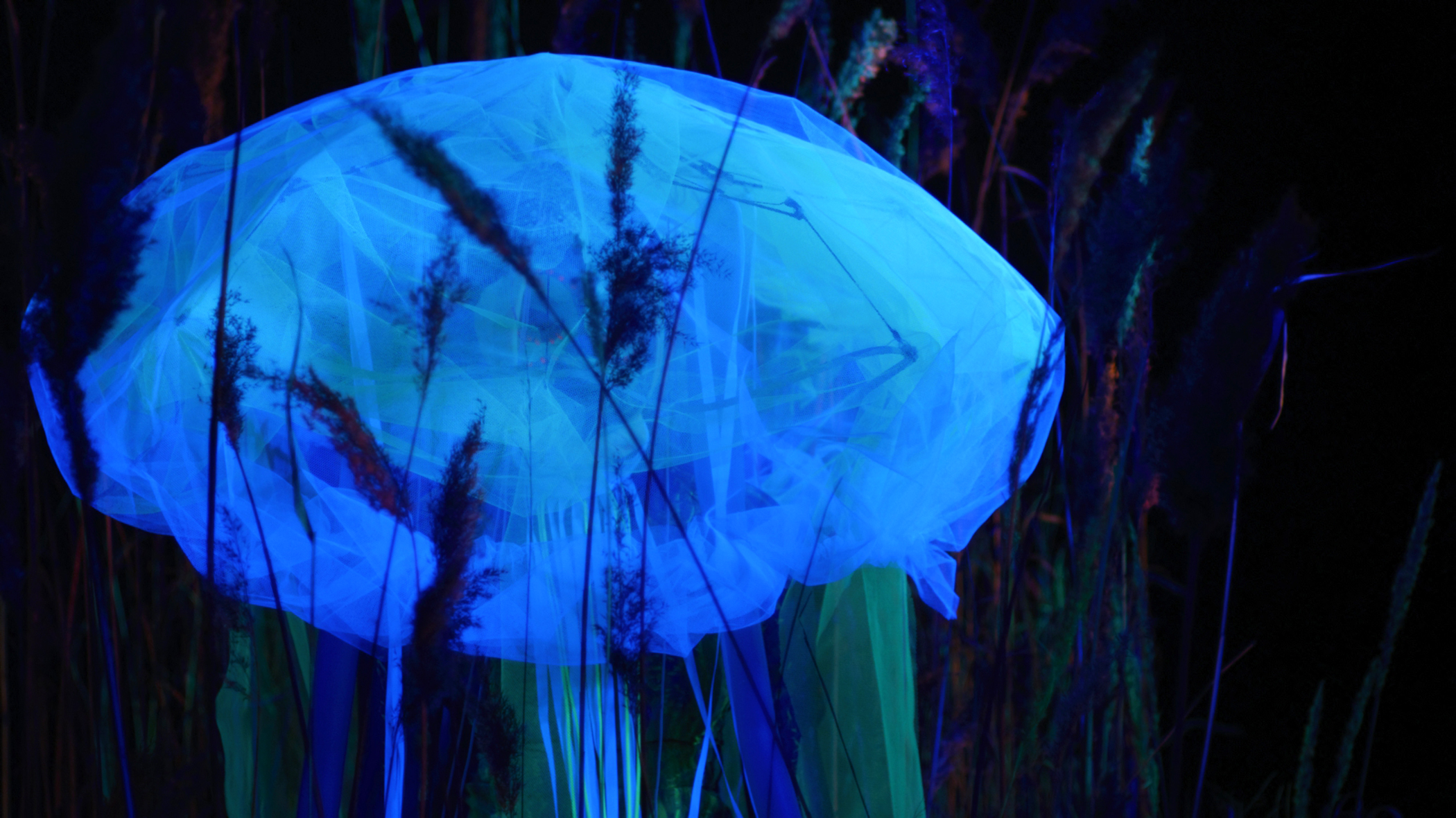 There is a gateway at the edge of the waters – not a physical gateway but rather a bottleneck that opens into a realm of shadows, leading into a dream. This dream has no inside or outside. It allows the return of what has already been experienced, suspending it in textures that flow into one another: reeds, sequins, coral, thread, tentacle, hair, moss, performer, reflection and likeness. All share the desire to not to become recognized, to impersonate before the camera one thing or another: cnidarian and plant, conscious and unconscious, body and landscape, art and nature.