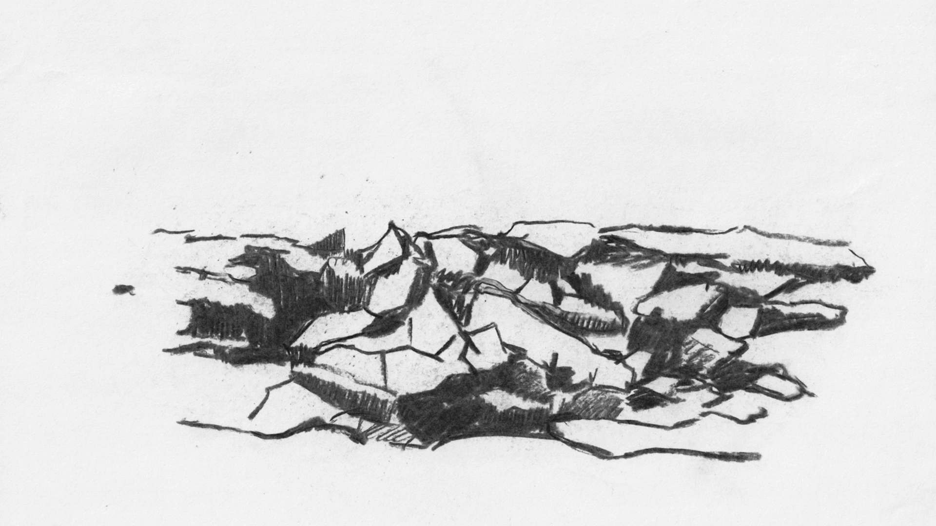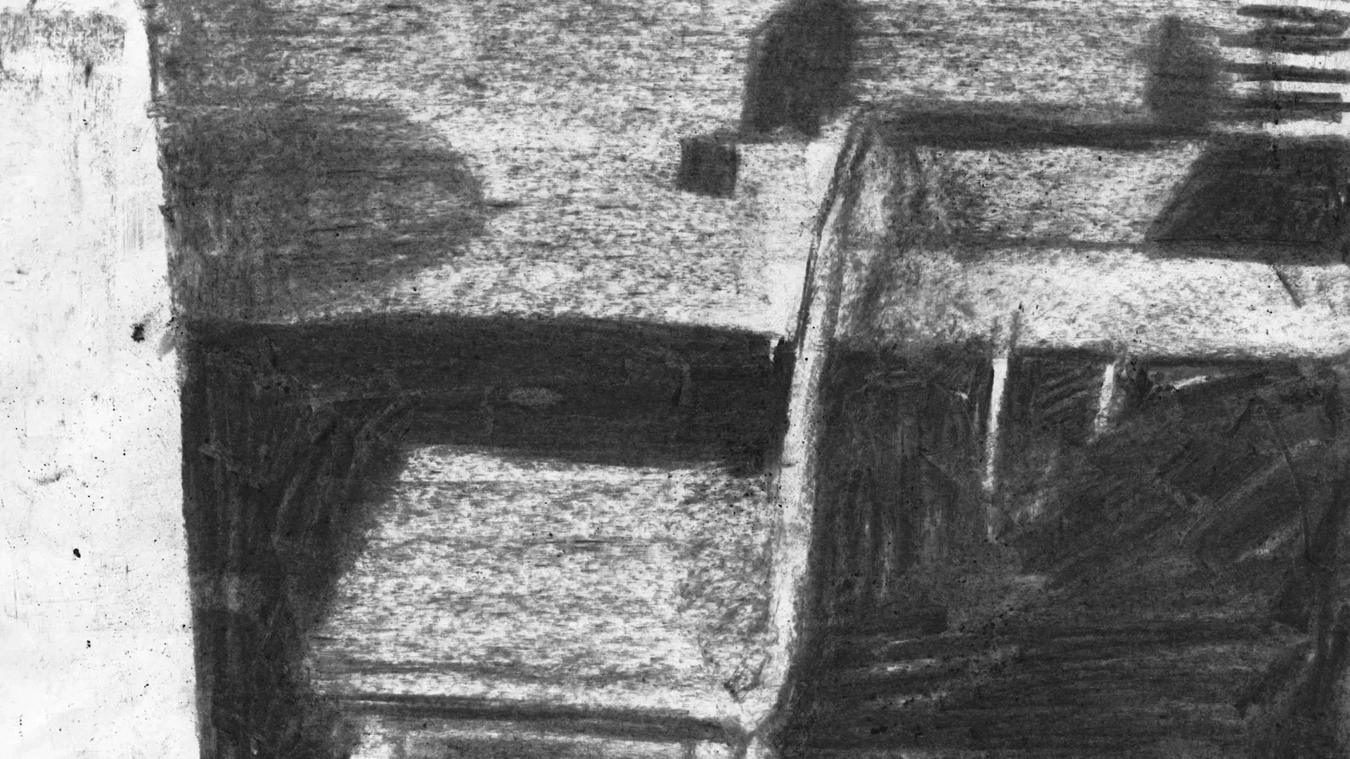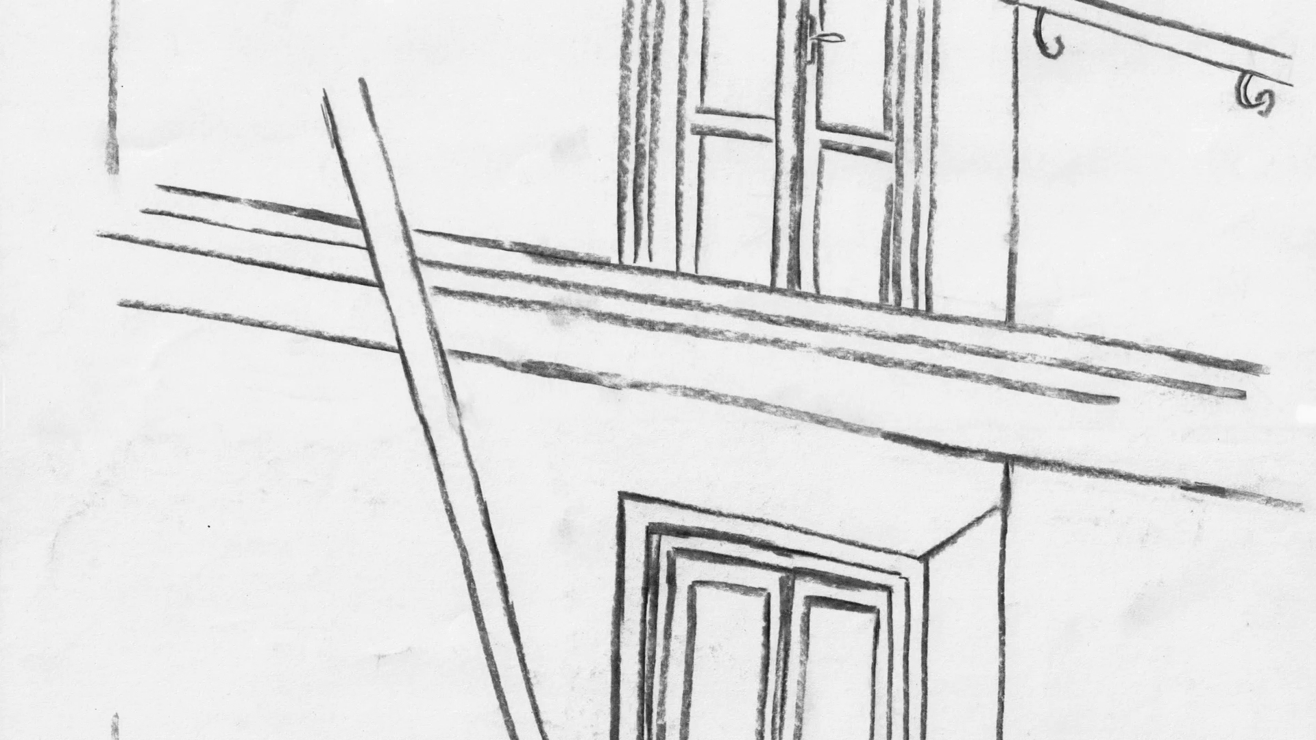 In Jirkuff’s animation, based on a story by Ilse Aichinger (1921–2016), the parts of the house develop a life of their own. Along with the handrail and the wallpaper, even the white drawing surfaces are affected: Jirkuff’s charcoal strokes and the coal dust from Aichinger’s text color them gray (after all, coal is stored in the cellar where the narrating voice ultimately ends up). Here, as previously in Vermessung der Distanz (2019), Susi Jirkuff’s interest is not only in the spatiality of the building, but also the (non-)behavior of the fellow humans. No one asks, “Didn’t you live next door to us just yesterday?”