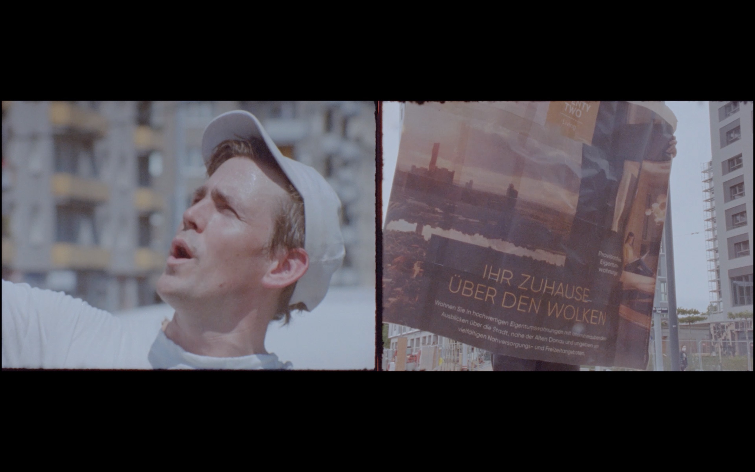 Bounding, shouting, showing his teeth, Tomash Schoiswohl jumps up and down in front of Viennese building landscapes where one luxury residential building after another is being raised up. In his hands he holds fluttering pictures of the high-rises being built and tells the stories of four building complexes that no longer exist.