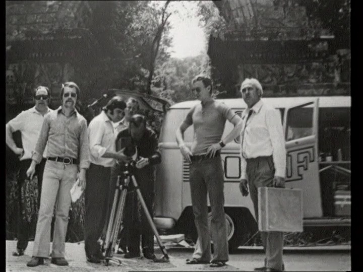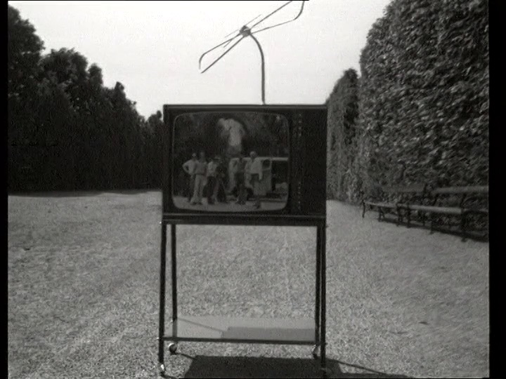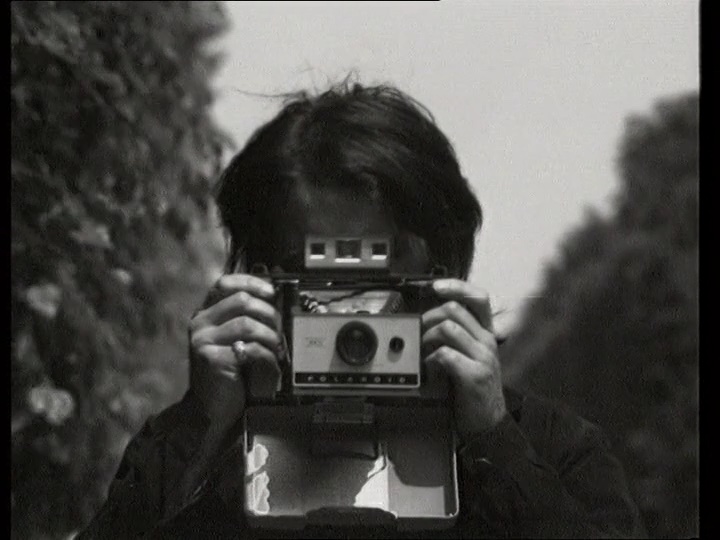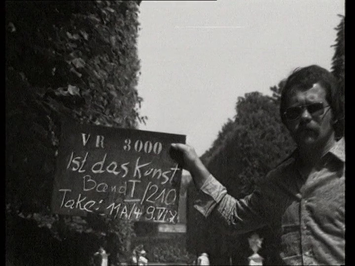 “An instant-camera and a TV camera are placed opposite one another. They operate at the same time: The actor takes photographs with the Polaroid camera, the TV team films. When shooting the picture (click!) the TV team’s camera stops. The time taken for the development process of the Polaroid photograph, approximately 20 seconds, is recorded by the TV camera: approximately 20 seconds of black film appears on the screen. The TV camera begins filming again just at that moment at which the actor takes the Polaroid photograph out of the housing. The picture is then developed as a close up: One can see the TV team on the Polaroid photograph. A continuous live tone is added to this. A reversal, a structural layering, a loop. The product shows the process. Jacques Lacan: ‘Accordingly, human language constitutes a communication, in which the sender is returned his own message by the receiver in a reversed form’.”