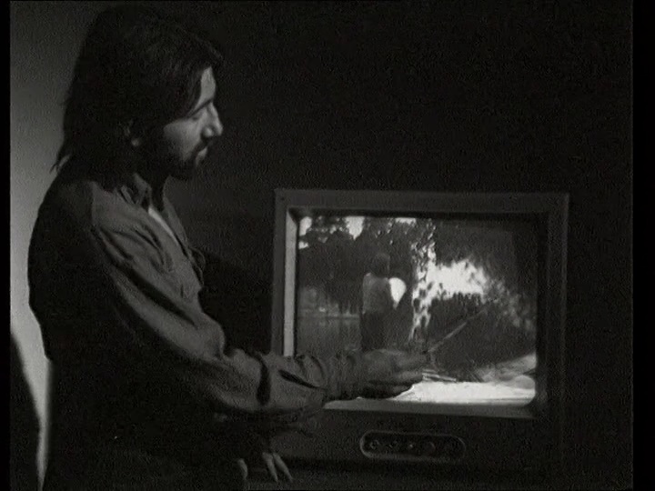 “I throw water in space with a bucket. A video camera pictures this. Another camera pictures this event from the TV screen. 3 modalities of reality: 3 levels of interpretation. Reality: filmed reality: filmed film.