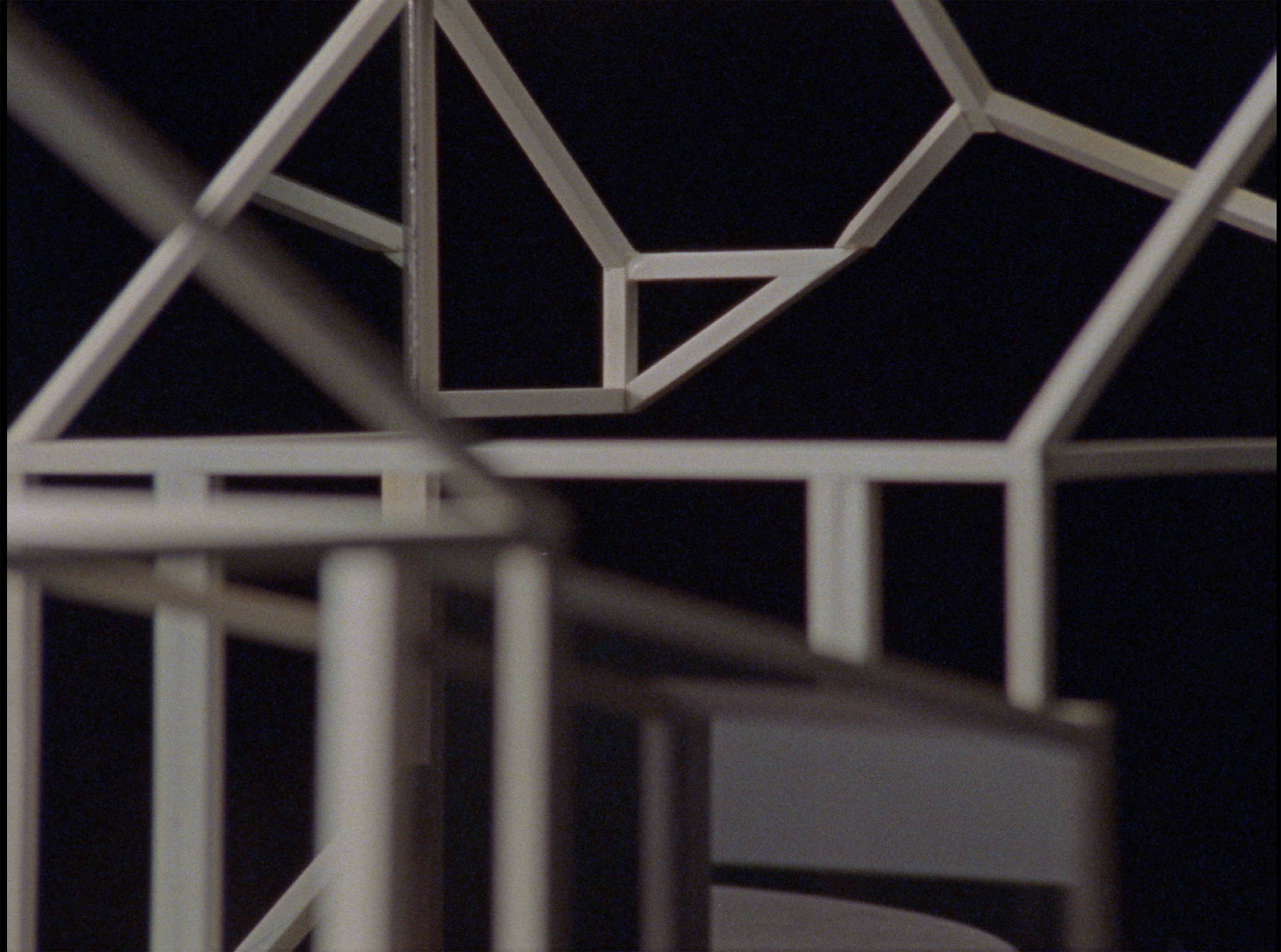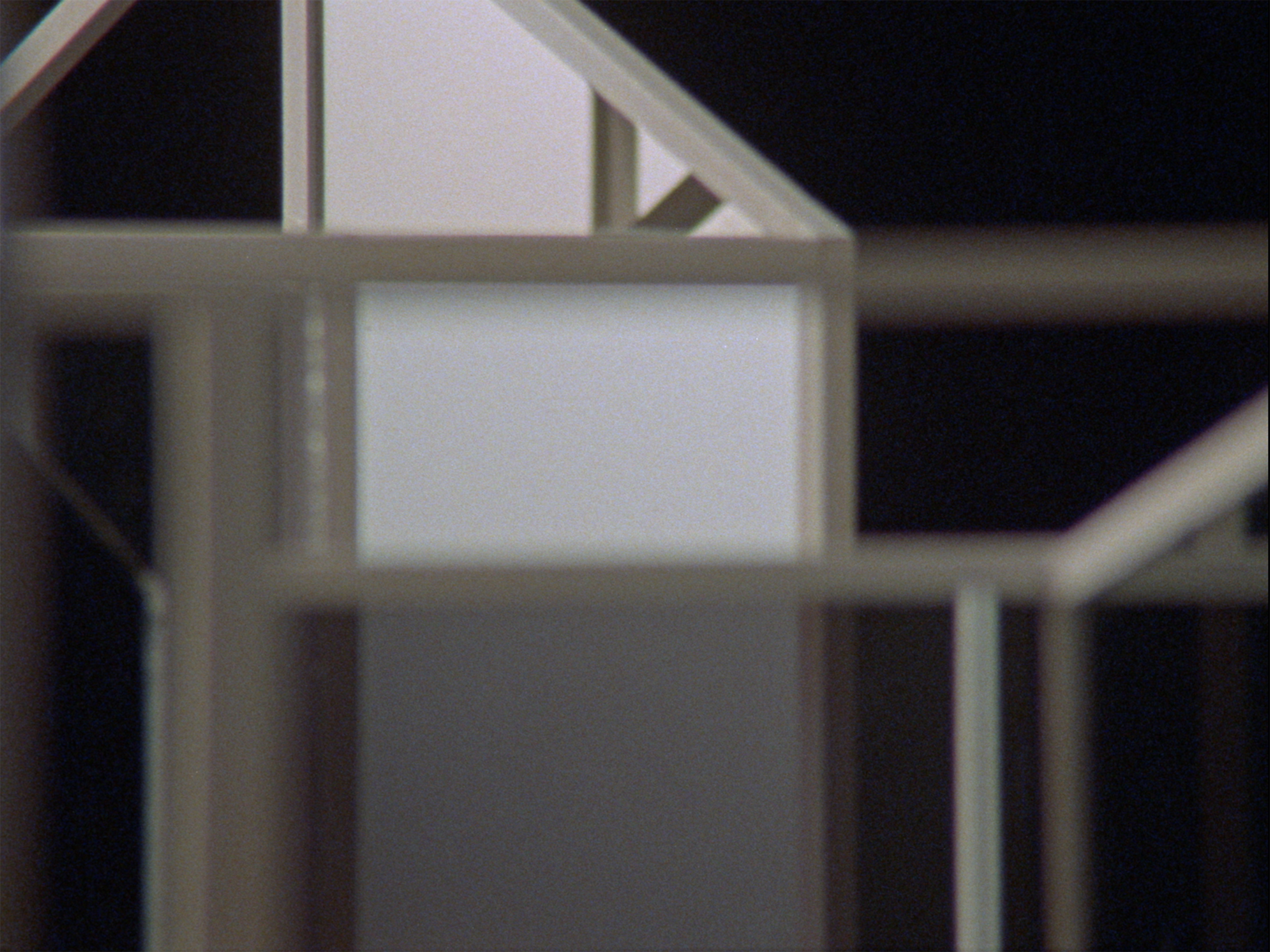 In his work Hidden Rooms, shot on 16mm film, white-painted wooden beams are joined together into building-like structures that glide across the image surface from right to left in slow and steady rotational movements against a deep black background. Oppl has inserted reflective glass surfaces into these abstracted building skeletons, which, due to the many reflections and the narrowly selected image sections, make it impossible for the audience to imagine an overall picture of the architectural models. Static shots, each one minute long, are spliced together and accompanied by harmonious sine tones, which rise and fall in sync with the incidence of light.