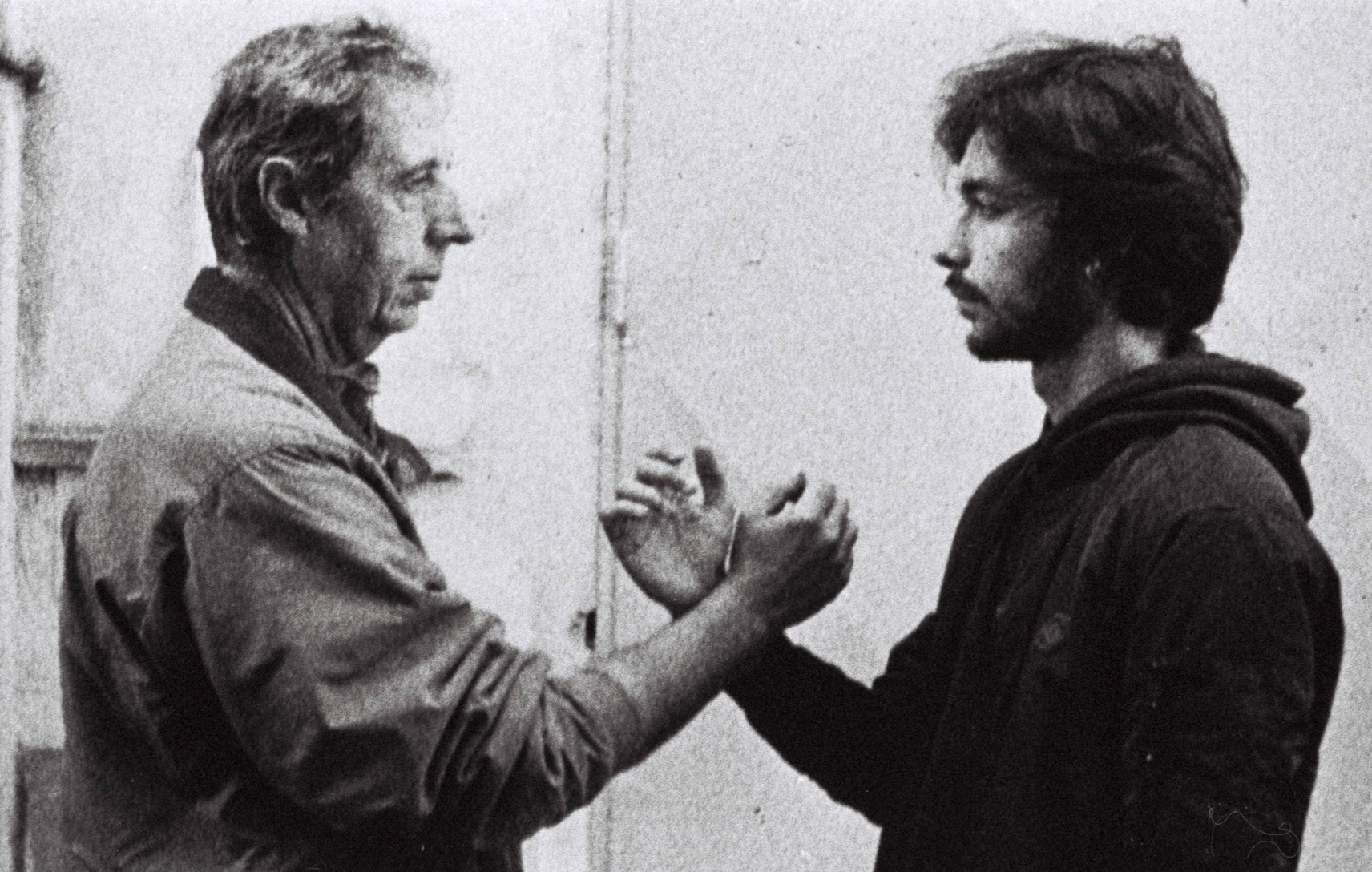 First comes a close-up of Bressonian inspiration: two right arms, lifted and hands open, meet mid-air, wrists united by a slight touch, as if glued together by an invisible force. It is not long before the faces and bodies matching those arms are revealed by the ensuing shot—two men of different ages stand facing each other. They remain in the same position as the background shifts with each cut, from the initial industrial-looking environment to an open street, to finally somewhere resembling the back of a historical edifice. Something about the filmmaker’s insistence on their immobility suggests more than a mere cinematic rendering of a gestural performance that would call to mind famed artists’ films from the 1970s; the repeated motionless gesture seen from a few angles invites a layer of metaphor, of welcome speculation—could this unlikely, suspended embrace refer to masculinity’s much-discussed inability for exhibiting non-romantic physical affection?... On a closer look, allowed by the following camera positions, one could say both men possess a slight resemblance—could they be father and son?... Or could it simply be two actors measuring each other’s pulse, as the title plainly states, in a playfully medical twist to the classic ‘coeur à coeur’?