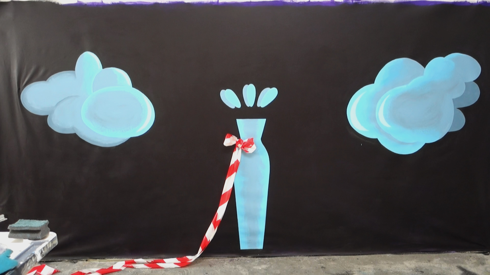 Two people, read as female, appear simultaneously naked before the camera. They take the stage in front of a stationary backdrop reminiscent of a variety show, moving pretty unambitiously to the rhythm of a Viennese waltz before exiting the stage three minutes later. The choreography: left arm to the hip, minimal hip swing; right arm to the hip, minimal hip swing; one step forward, one step back. Repeat. A black canvas hangs in the background painted with two blue clouds to the left and right, and a blue vase in the center containing an abstract bouquet of flowers, adorned by an actual bow of red-white-red barrier tape – these also happen to be the colors of the Austrian flag. On stage, a painter's atelier table with a sponge cuts into the left edge of the foreground. The waltz we hear was composed by Johann Strauss – in German a "Strauß" is a bouquet of flowers – entitled “The Blue Danube”, echoing the blue of the stage's backdrop. The allusions are clear and simultaneously ironic, the scene is ambiguous and wonderfully imperfect as staged by Ashley Hans Scheirl and Ursula Pürrer for this short film, which is in fact a remake.