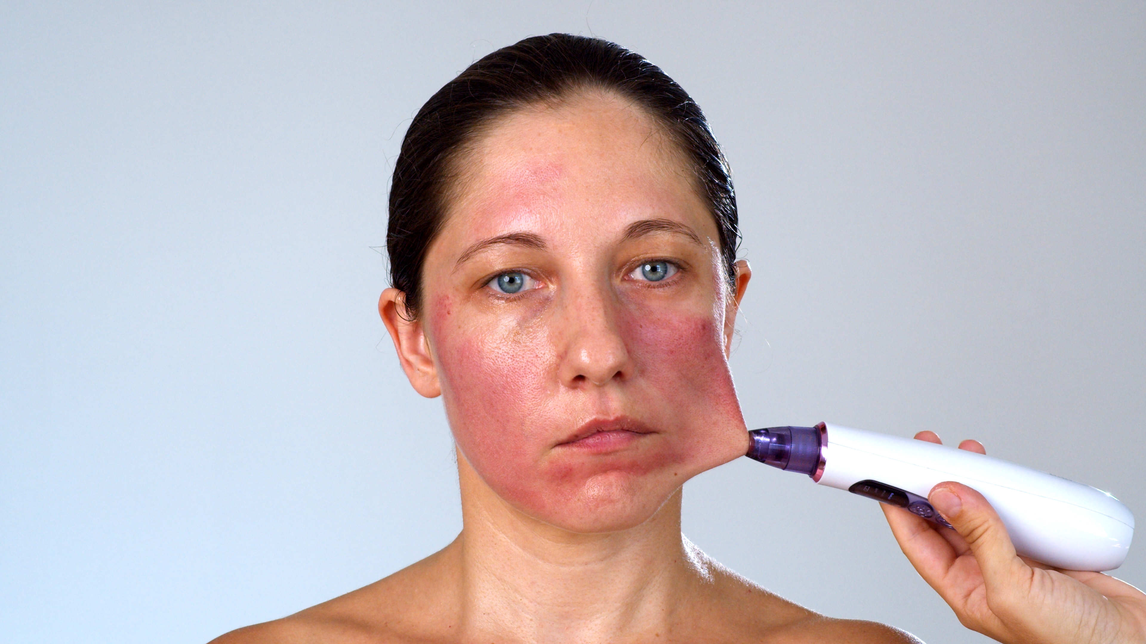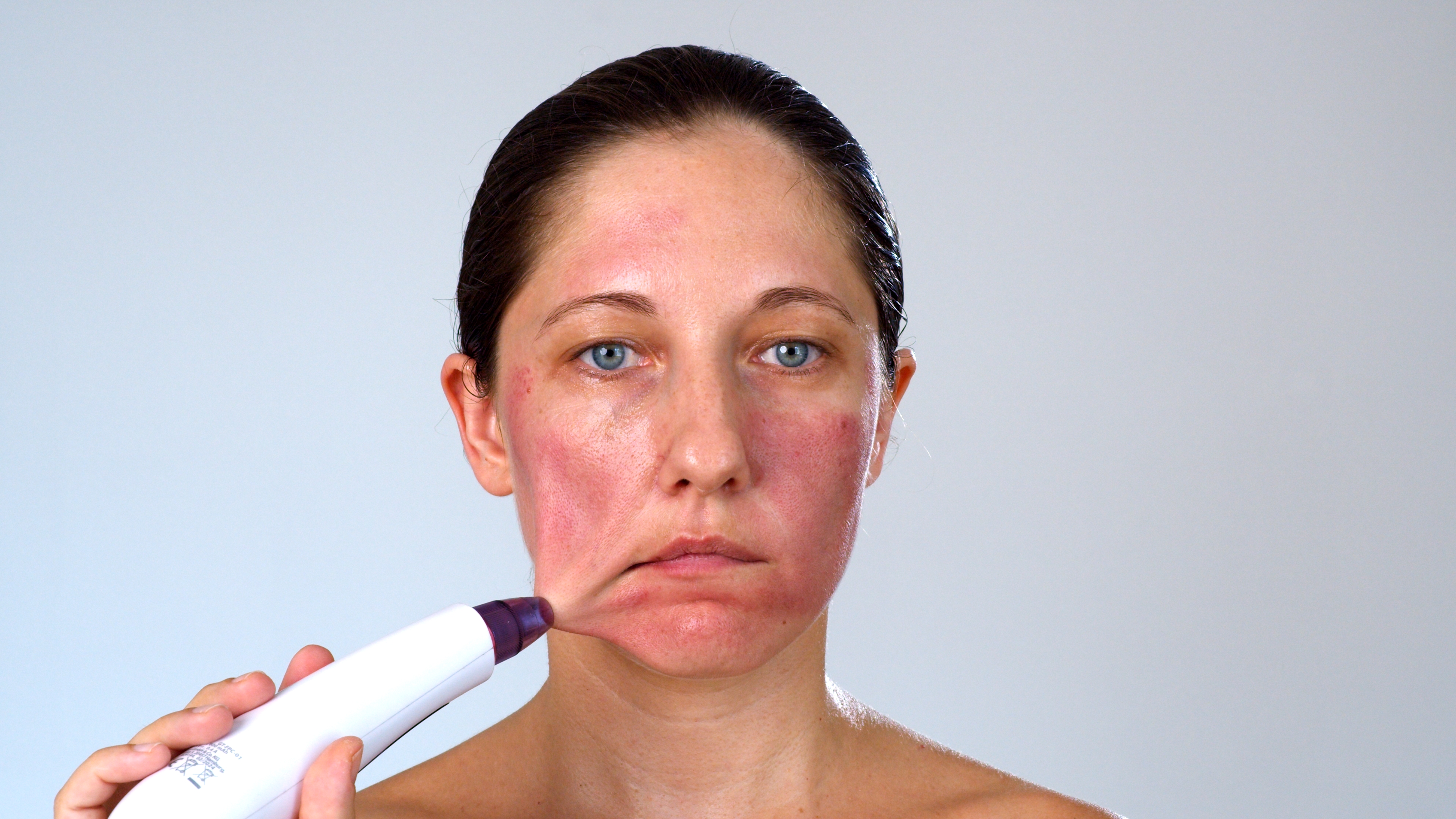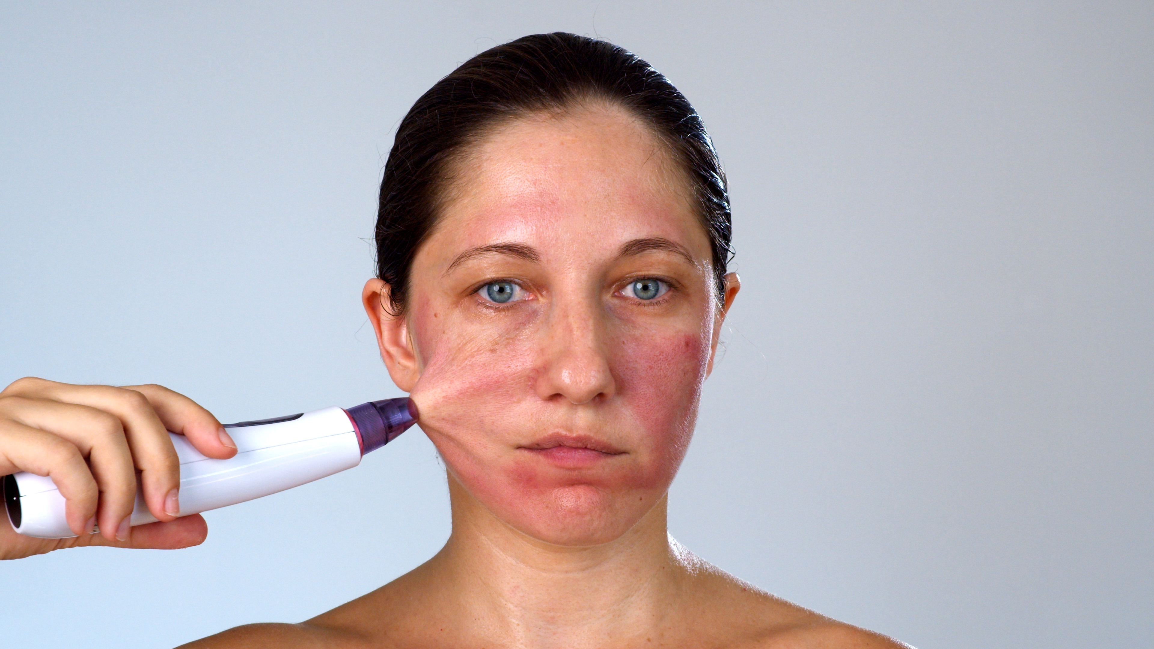 Equally compulsively, she also abuses her face with a pore cleaner, a skin care device that is supposed to be used to remove blackheads. In enough, Lisa Großkopf does not cleanse her skin, but tortures it at the highest suction level with the same consistency and persistence as her autosuggestion. Her face increasingly turns dark red, caused by skin bleeding, and stands as evidence of deliberate disfigurement. And as with some of her famous predecessors such as Marina Abramovic, Orlan, and Martha Wilson, the sight of the self-inflicted abuse has a long-lasting effect. (Brigitta Burger-Utzer)