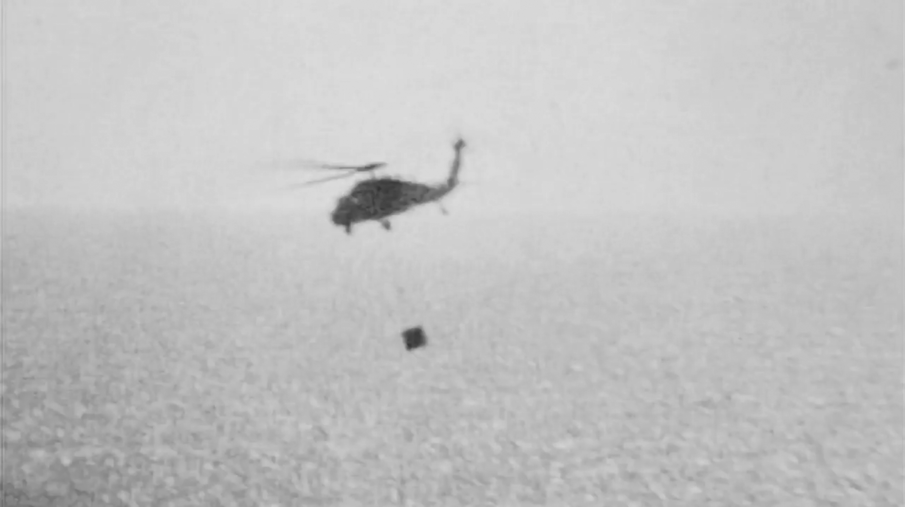 Schreiber repeatedly finds visual equivalents for the sounds in the montage, creating synchronized effects between image and sound. As the synths increase their tempo and the hypnotically rhythmic sound becomes more disruptive, the rotor blades of a helicopter flutter to the same beat, and the stability of the camera begins to waver. A high, sustained tone complements the composition and helps direct the gaze to the elongated lines of the highway guardrails.