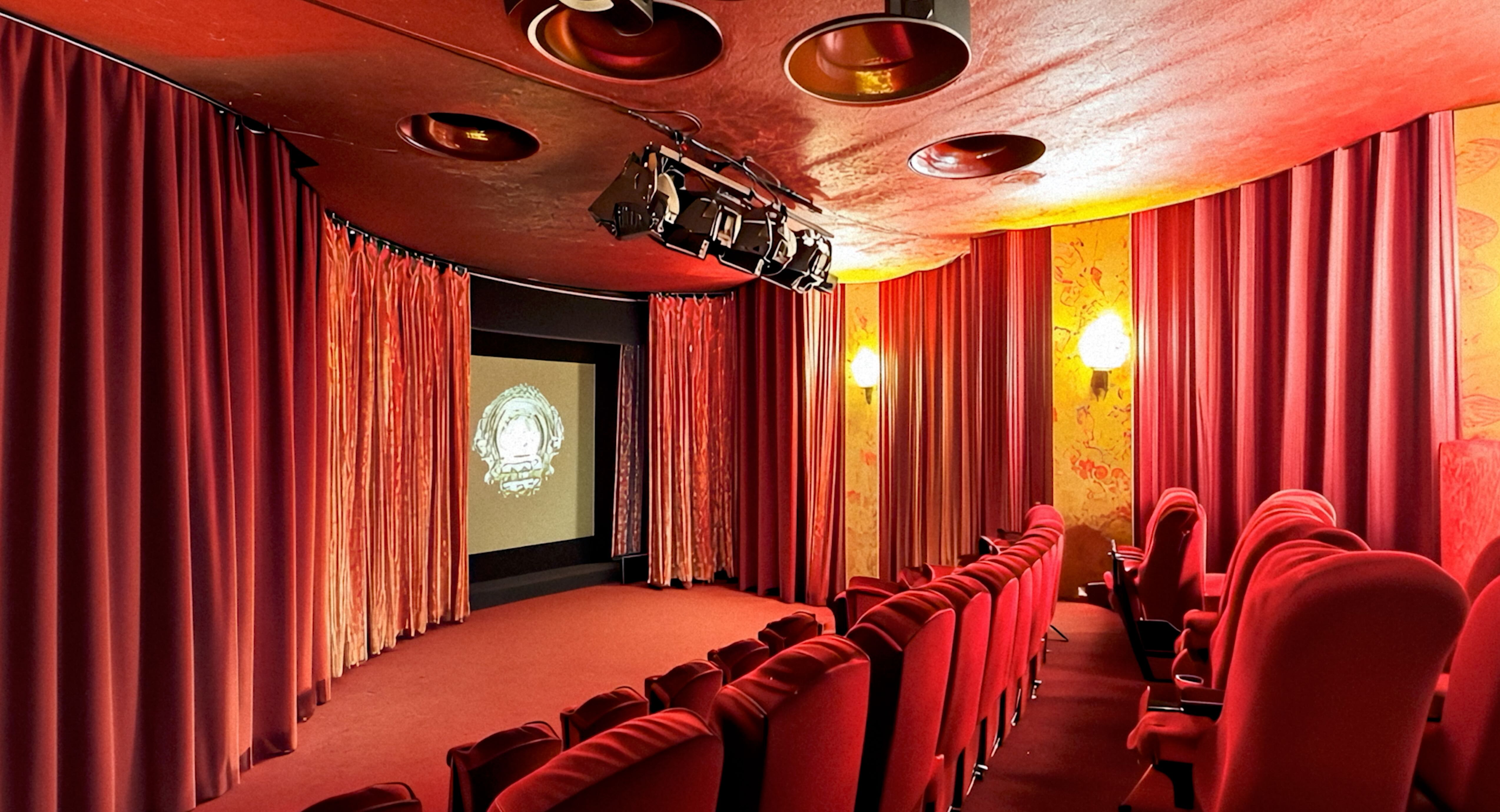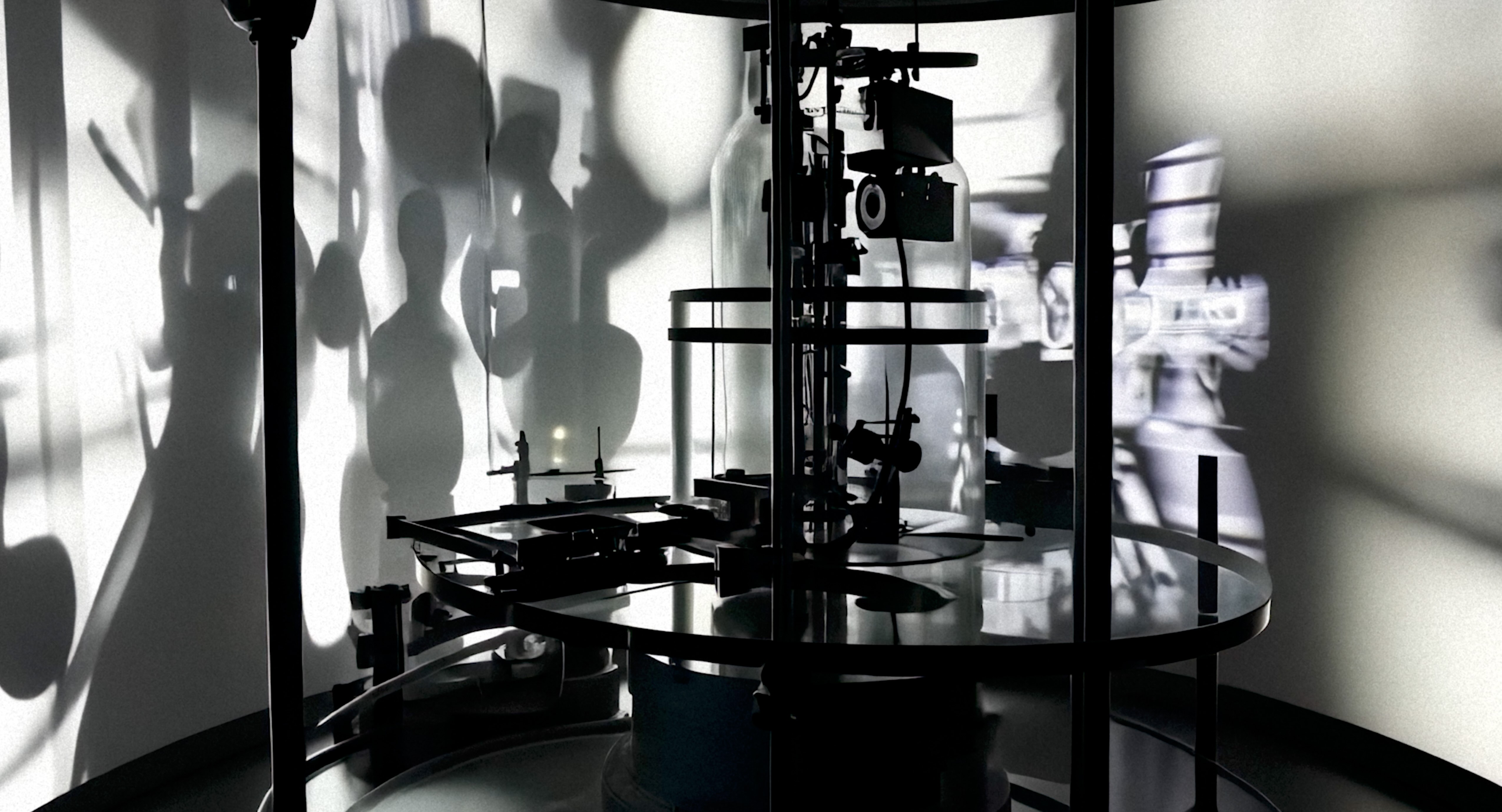 There’s rattling and crackling. We hear the whir of a projector, the clicking of old cameras. The room is in flux, fragments intertwine, curtains slide open and reveal ever-changing views of the filmmaking equipment and the cinema space – or is it the projection booth? Where is the audience? Shadow plays reminiscent of film noir instantly dissolve and morph into seemingly lifelike silhouettes. And finally, the audience appears. But instead of staring at the screen, they gaze, spellbound, into their VR headsets. The movie theatre seems like a relic from the future: familiar yet uncanny.