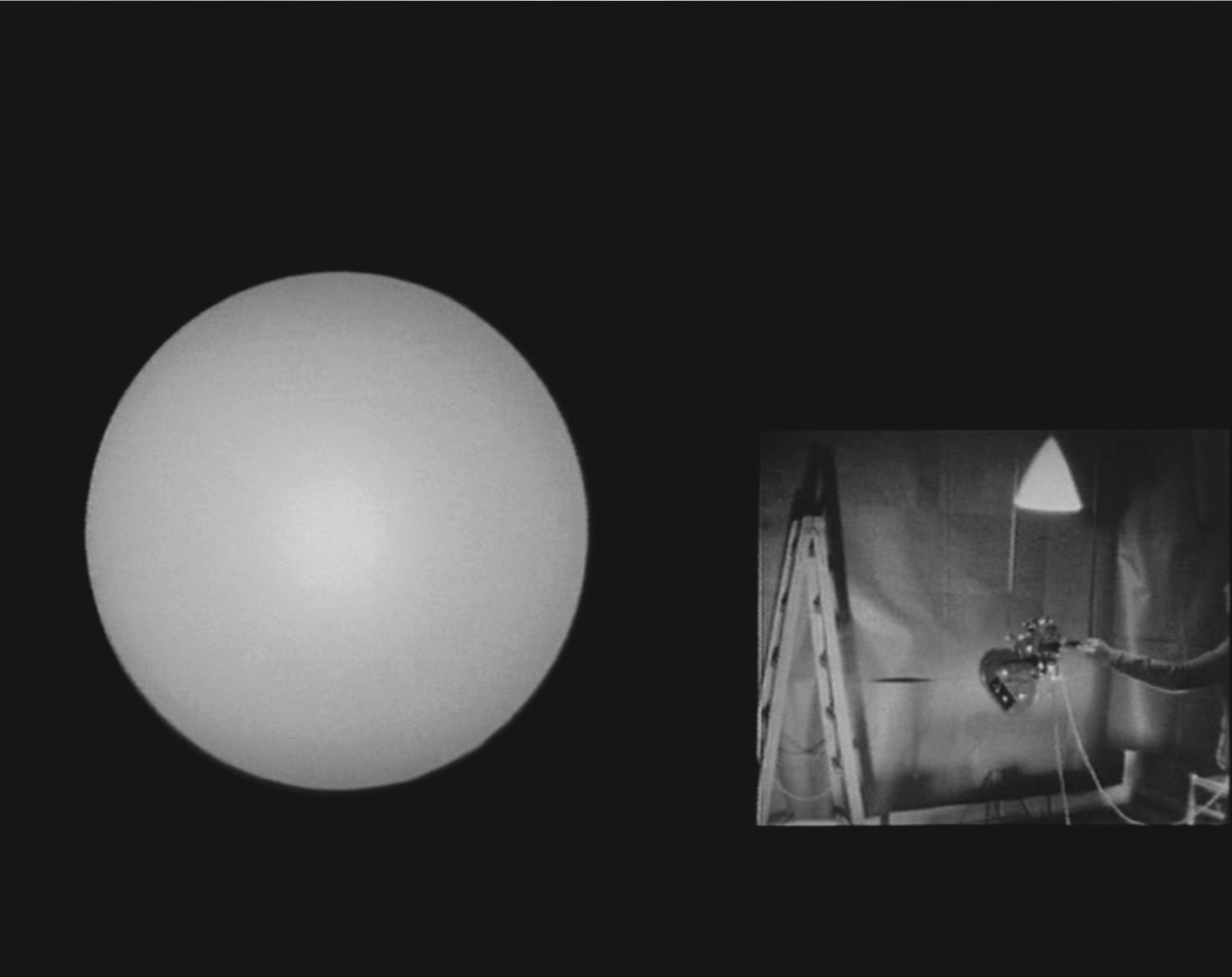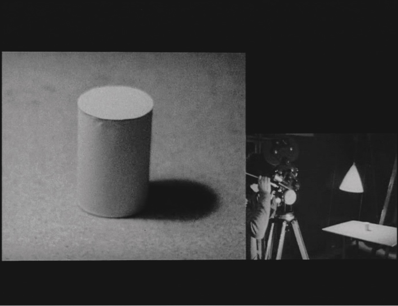 A model experiment to analyse the relativity of movement seen on screen. It was conceived for two film strips, two projectors displayed simultaneously–as a kind of expanded cinema.