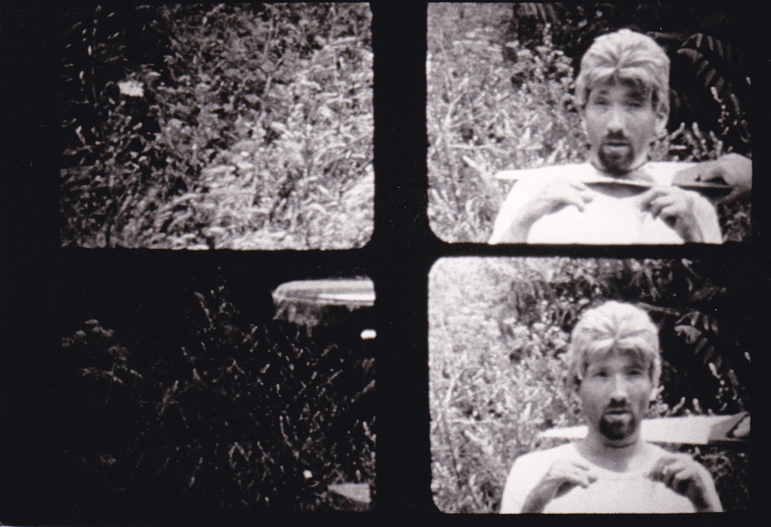 Dieser wird wiederholt, sodaß faktisch derselbe Ablauf, die gleiche Geschichte dreimal zu SEHEN ist, während auf der Tonspur Pere UBU mit einem Song zu HÖREN ist, der sich aber nicht ums Bild kümmert, sondern kommt und geht und frei jedes bedeutungsschwangeren Impetus ist. Aufgenommen wurde das Bild mit einer alten Normal-8-Kamera, jenem Amateurformat, das dem Super 8 voranging. Durch eine spezielle Aufnahmetechnik und das "Nicht-Splitten&qout; des Normal-8-Röllchens (das somit als 16mm-Film gespielt werden kann!) entsteht die Vier-Teilung des Bildes. Da das Normal-8-Röllchen aber sozusagen links und rechts gegenläufig belichtet wird, muß die Aktion in etwa 4.000 Einzeleinstellungen zerlegt werden, für die rechte Bildhälfte die Kamera "auf den Kopf" gestellt werden und die Bewegungen rückwärts abgewickelt werden etc., was minutiöse Vorbereitungen und ein ca. 100 Seiten starkes Skript erforderte. Auch gibt es keinen Schnitt und die Doppelbelichtungen erfolgten ebenfalls in der Kamera. Die Anweisungen an die Darsteller lauteten etwa so: