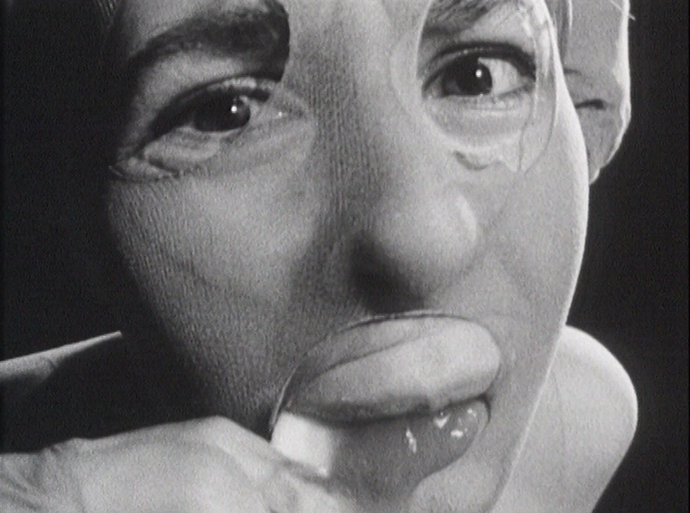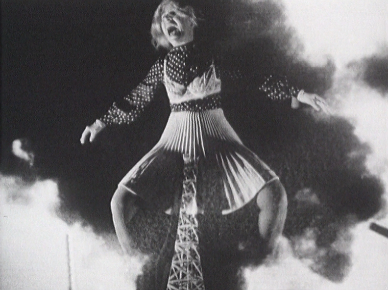 The world as a plaything for a giantess from outer space. A Godzilla-imitation on the way to herself: the giantess from outer space in the streets of a big city, fooling around, producing destruction, copulating with the Eiffel Tower. An orchestra of big feelings, the melodrama, defamed in infantile sounds and absurd costume, in make-up-persiflage and grotesque body-art-performances. E.T. staggers through the night & the City, looks like Mimi Minus and grabs little projected human beings with her hand, just like the huge infatuated monkey of the horror genre. And the cinema of war and catastrophies watches with an open mouth until a toy city - which desperately tries to be a real one - finally collapses laconically. (Stefan Grissemann) A visit from outer space. The short-sighted giantess "Extra Terrestria" goes on a devastating sightseeing-tour around the world. (Prouction note) With the revenge of the bad girl invading just about every sub-pop cultural milieu in the white world at present, Mara Mattuschka shows us how B-grade movie mythologies, and what can only be described as eco-surrealist feminist anarchy, can gel to create a disturbing and hilarious poetic satire of a girl´s own sense of power and domination. Part Godzilla/King Kong monster mutation, part Lilliputian/Alice in Wonderland giantess, Mattushka´s Mimi Minus stampedes through a toy city crushing humans in her wake until the city itself crumbles and collapses into a heap. In true riot-girl fashion, the film comes off somewhere between retro post-punk rage rhetoric and semi-earnest body-performance art show, adding a new twist to an already established genre of ´girl´s own story´ flicks. (43. Melbourne International Film Festival Cataloge, 1994)