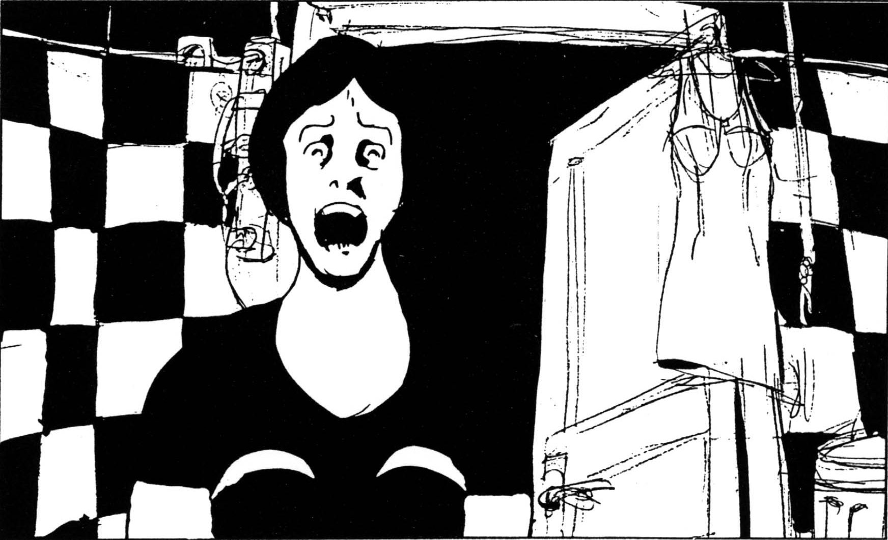 One thing soars into the other. Flying fork attacks are echoed later in those just quietly wriggling. Room decoration finds its counterpart in the drain of the shower. Deputising, the mixer attacks the toaster. The heroine gives birth to her own double.