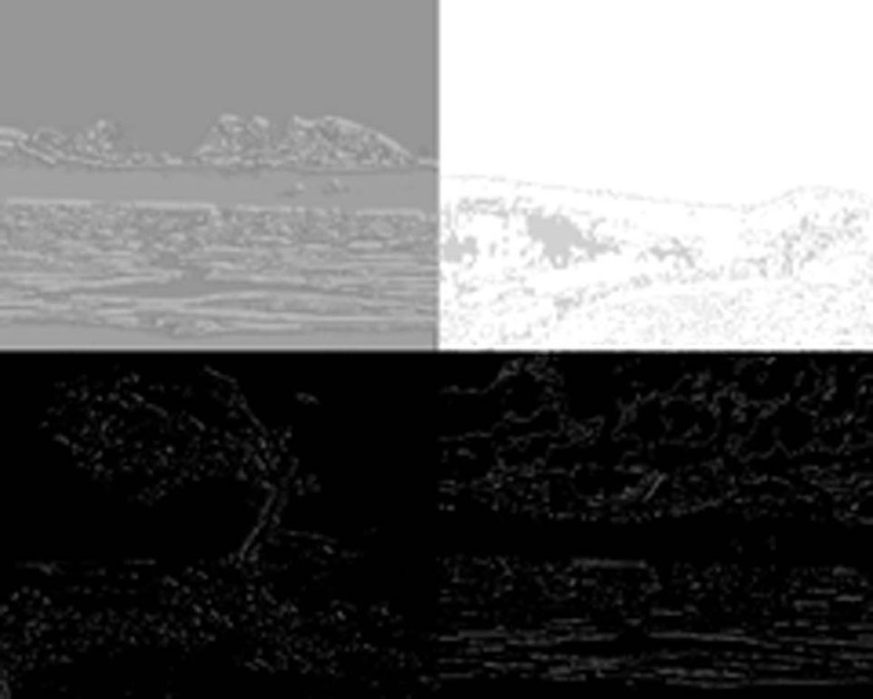 A fourfold split screen shows views of this place in a kaleidoscope of animated digital postcards. The normal associationsævisions of majestic, or at least marketable, beauty, of exotic or untouched wildernessæare consistently undermined in KILVO. Instead of showing an idyll, the landscape is reduced to the greatest degree possible. Lines and contours are stripped from the background of black, white and gray tones. The viewer cannot be sure what is being shown, or implied. For brief moments fleeting images appear, then change or are lost. Faithful reproductions are not the important thing here, but the digital transformation of a real landscape into an abstract pattern, translation into a completely different visual form which at the same time conforms to this landscape.