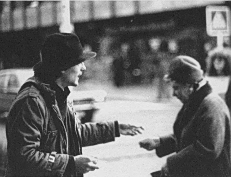 Hintze represents a principle and a bundle of facts. He’s the result of 1.2 million physical contacts. He communicates information, poems, aphorisms and microscopic fragments of thoughts hand to hand, on small pieces of paper that record his vision; reports on the present state of affairs. The Austrian filmmaker Alfred Kaiser is Hintze’s opposite: He doesn’t look for truth, but film truth. Still, he turned Hintze and his forays into a film. Their meeting is one of those inexplicable events that take on a motivation afterward, so they don’t seem to be coincidences.